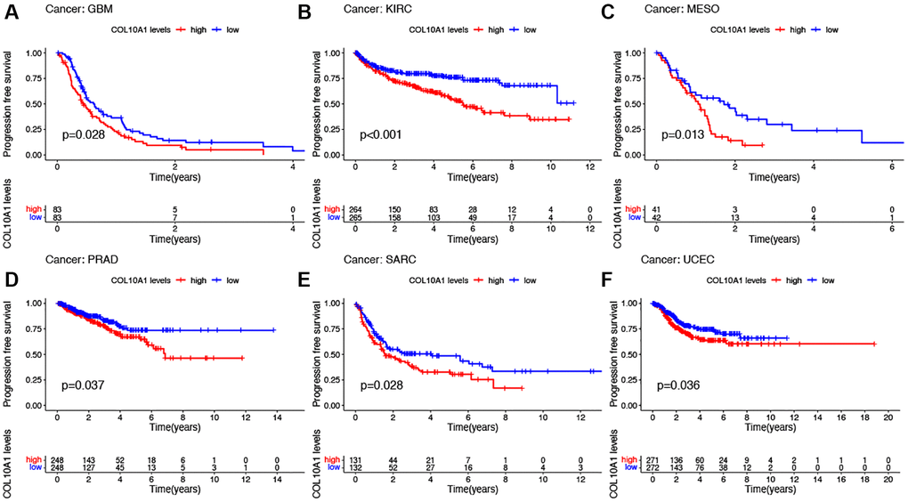 Notably, in GBM, KIRC, MESO, PRAD, SARC and UCEC, the survival duration was markedly longer in the low expression level group than in the high expression level group (Figure 5A–5F). Cox regression showed that COL10A1 was associated with PFS in five cancer types: GBM (p = 1.43E-04, HR = 1.684), KIRC (p = 1.86E-05, HR = 1.409), KIRP (p = 7.48E-07, HR = 2.289), PAAD (p =0.006, HR = 1.172) and PRAD (p = 0.003, HR = 1.283) (Supplementary Figure 2D). To conclude, COL10A1 was a risk factor for all these cancer types mentioned above.