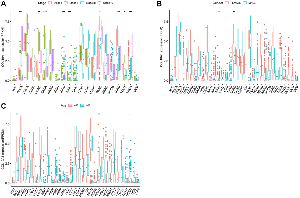 High COL10A1 mRNA levels were correlated with more advanced tumor stage in BLCA (p < 0.001), COAD (p < 0.01), ESCA (p < 0.001), KIRC (p < 0.001), KIRP (p < 0.001), PAAD (p < 0.05), STAD (p < 0.001), TGCT (p < 0.05) and THCA (p < 0.001) (Figure 6A). Notably, a pronounced gender-related disparity in COL10A1 expression levels was observed in KIRP and LUAD. COL10A1 levels were higher in females than males in KIRP (p < 0.01) and LUAD (p < 0.01) (Figure 6B) group. In comparison to younger patients, COL10A1 was highly expressed in BLCA (p < 0.01), PRAD (p < 0.01) and low in UCEC (p < 0.05) (Figure 6C).