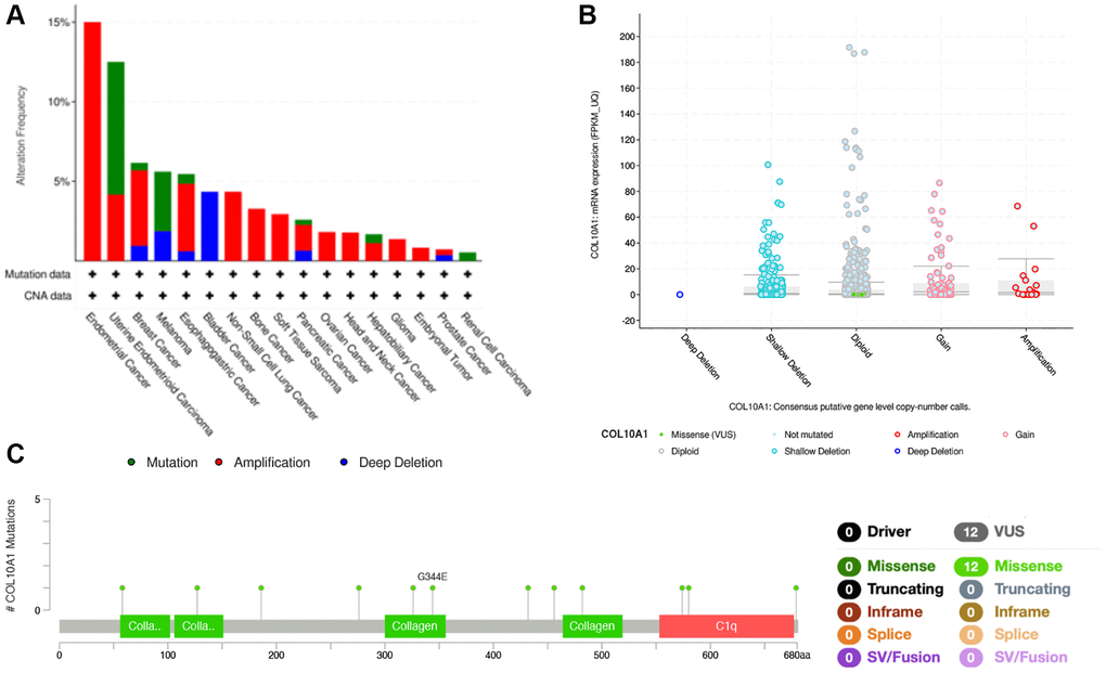 COL10A1 copy number alterations were assessed by cBioPortal database. Among various human cancers, Endometrial Cancer had a much higher mutation frequency (Figure 7A). Interestingly, in BLCA, deep deletion was the only type of genetic alteration. Moreover, it was found that amplification was the most common type of mutation at the pan-cancer level (Figure 7B). Meanwhile, using the cBioPortal database, COL10A1 mutations was screened in different cancers and 12 missense sites between amino acids 0 and 680 was identified (Figure 7C).