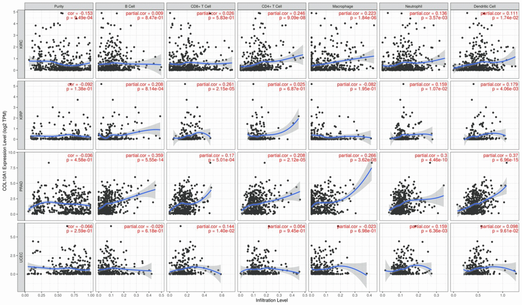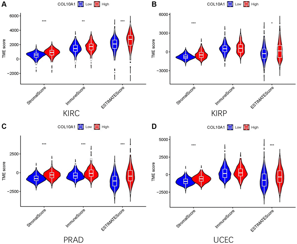 The relationship between immune cell infiltrated and COL10A1 levels in pan-cancer was assessed using the TIMER database (Figure 8). It is noteworthy that the level of all immune infiltrating cells in prostate cancer was positively correlated with COL10A1. The same correlation was also observed in BRCA. By contrast, there was no association between COL10A1 level and the infiltration of immune cells in UVM (Supplementary Figure 4). After a comprehensive analysis of gene expression, correlation of prognostic and clinical features, and immune cell infiltration, our team selected KIRC, KIRP, PRAD, and UCEC as the four most investigated four cancers for analysis. Higher COL10A1 expression was associated with higher stromal score, immune score and ESTIMATE score in KIRC and PRAD (Figure 9A, 9C), while only higher stromal score and ESTIMATE score were found associated with higher COL10A1 expression in KIRP and UCEC (Figure 9B, 9D).