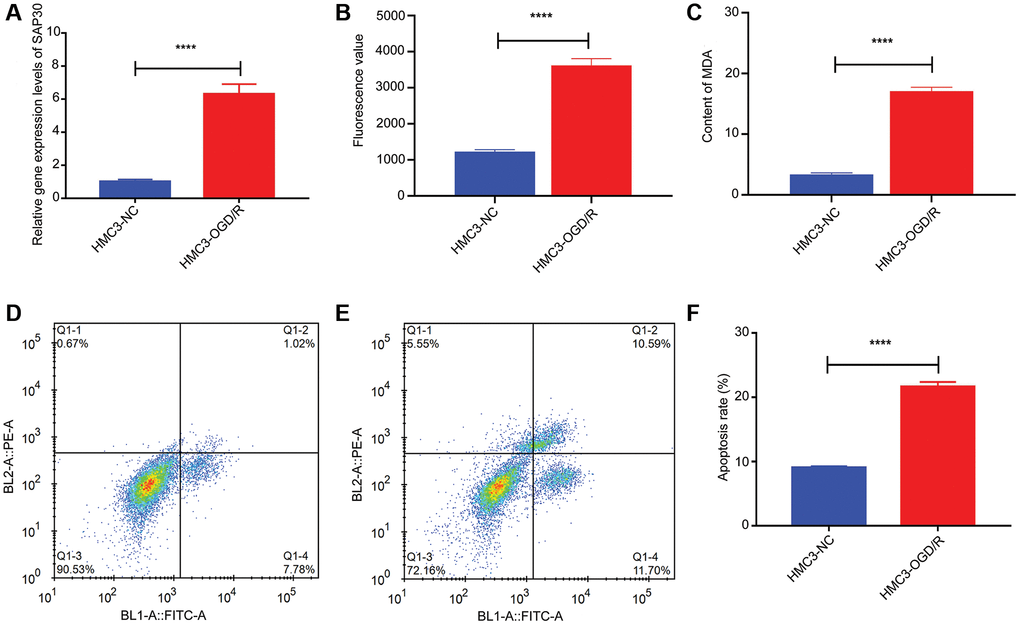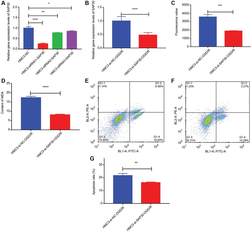 CCR7, S100A12, SAP30 and SLC2A3 were selected for real time-PCR validation to detect the relative expression levels in HMC3-OGD/R model group and HMC3 control group. The results showed that only SAP30 was significantly increased in the HMC3-OGD/R model group and the expression trend was consistent with the results of bioinformatics analysis (Figure 9A). Therefore, SAP30 was selected for the follow-up experiment. In addition, the relative expressions of ROS and MDA and apoptosis of cells in HMC3-OGD/R model group and HMC3 control group were also detected. The results showed that the contents of ROS and MDA in the HMC3-OGD/R model group were higher than those in the HMC3 control group (Figure 9B and 9C), and the HMC3-OGD/R model group also had higher apoptosis rate (Figure 9D–9F). SAP30 was selected to knockdown in HMC3 cells. Then, the expression of SAP30 was detected by real time-PCR to screen out effective interference targets. The results showed that target 1 had the best knockdown effect (Figure 10A), so siRNA1-SAP30 was selected for subsequent experiments. Subsequently, the relative expressions of SAP30, ROS and MDA and apoptosis of cells in HMC3-si-NC-OGD/R group and HMC3-si-SAP30-OGD/R group were also detected. The results showed that the expression levels of SAP30, ROS and MDA in HMC3-si-SAP30-OGD/R group were significantly decreased (Figure 10B–10D), and the apoptosis rate was also significantly decreased (Figure 10E–10G). These results suggest that inhibition of SAP30 expression in CIS may reduce cell apoptosis and inhibit ROS and MDA production, thus playing a regulatory role in disease progression.