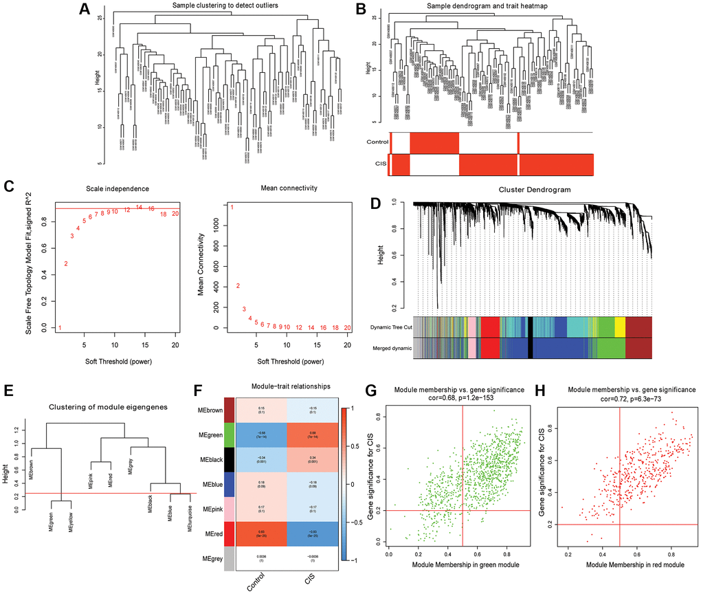 The WGCNA package was used to analyze the mRNA in the top 25% of the coefficient of variation in GSE58294 dataset, and a scale-free gene co-expression network was constructed. The “hclust” function and the “pickSoftThreshold” function were used to detect outliers and select the appropriate soft threshold power (β) regulator, respectively. Subsequently, the adjacency matrix is calculated according to the kernel value [14]. Genes with similar expression patterns were grouped together, and modules were divided according to the “cutreeDynamic” function with default parameters. Then, the dynamic tree cutting method was used to merge the modules with the similarity <25%. To determine the most related module with CIS, the “Moduleeigengenes” function was used to calculate the module eigengene (ME) of each module. Subsequently, Pearson correlation method was used to analyze the correlation between ME and CIS. The module with the highest correlation with CIS was selected as the hub module. Finally, candidate hub mRNAs were selected according to the module connectivity (MM) >0.2 and clinical trait relationship (GS) >0.5 of each gene in hub modules [15].