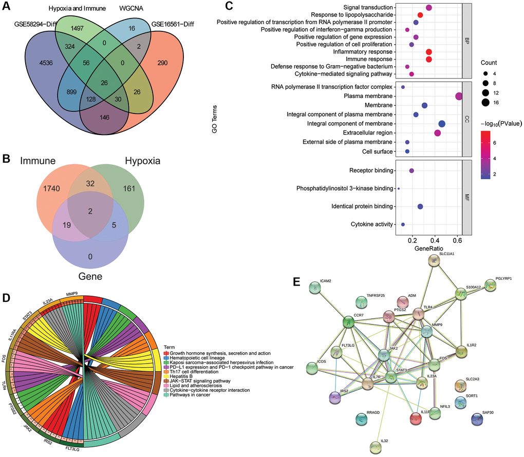 The intersection of the DEmRNAs in the GSE58294 dataset, the DEmRNAs in the GSE16561 dataset, the candidate hub mRNAs in the WGCNA and the set of IRGs and HRGs were taken. In order to understand the biological functions of intersection mRNA, GO and KEGG functional enrichment analysis was performed based on DAVID database (https://david.ncifcrf.gov/). GO functional analysis includes 3 categories, namely biological process (BP), cellular component (CC) and molecular function (MF). P < 0.05 was considered statistically significant. In addition, a protein-protein interaction (PPI) network was constructed based on STRING database (https://cn.string-db.org/) to study the regulatory relationship between intersection mRNAs.