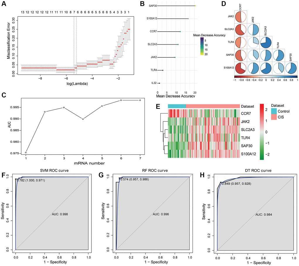 After LASSO analysis, 7 mRNAs were screened out from 26 intersection mRNAs (Figure 4A). The 7 mRNAs were ranked according to mean decreased accuracy values (Figure 4B). One mRNA was added at a time from top to bottom according to the ranking order. Then, RF algorithm was used for classification, and AUC was obtained by 10-fold cross validation. The results showed that AUC reached the maximum value when the number of mRNAs reached 6 (Figure 4C). These 6 mRNAs (CCR7, JAK2, S100A12, SAP30, SLC2A3 and TLR4) were considered as hub mRNAs, among which S100A12, JAK2, CCR7 and TLR4 were IRGs, and SAP30 and SLC2A3 were HRGs. The correlation between CCR7, JAK2, S100A12, SAP30, SLC2A3 and TLR4 is shown in Figure 4D. Compared with the control, JAK2, S100A12, SAP30, SLC2A3 and TLR4 were up-regulated and CCR7 was down-regulated in the CIS (Figure 4E).