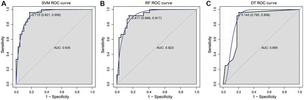 Subsequently, SVM, RF and DT classification models were constructed based on 6 hub mRNAs in GSE58294 dataset (Figure 4F–4H). The results showed that the AUC values of SVM, RF and DT classification models were 0.998, 0.996 and 0.984, respectively, which implied that these three classification models had high diagnostic accuracy. Subsequently, ROC analysis of the 6 hub mRNAs showed that the AUC >0.7 (Supplementary Figure 1), which implied that they also had high diagnostic accuracy. However, the AUC of 6 hub mRNAs was less than SVM, RF and DT classification models, which implied that the diagnostic accuracy of classification models were higher than that of single hub mRNAs. In addition, e1071, randomForest and rpart packages were also used to construct SVM, RF and DT classification models based on the 6 hub mRNAs in GSE16561 dataset with the same parameters to verify the diagnostic value. The results showed that the AUC values of SVM, RF and DT classification models were 0.935, 0.923 and 0.856, respectively (Figure 5). At the same time, ROC analysis of 6 hub mRNAs was also performed in the GSE16561 dataset (Supplementary Figure 2). The results showed that the AUC >0.7 of 6 hub mRNAs, but less than the AUC value of classification models. This again indicates that the classification models based on the 6 hub mRNAs has high diagnostic accuracy, which may be beneficial to the diagnosis and management of CIS. Moreover, the MLP classification model was constructed based on the 6 hub mRNAs in the GSE58294 (Supplementary Figure 3A) and GSE16561 (Supplementary Figure 3B) datasets. The results showed that the AUC values of the MLP classification model in the GSE58294 and GSE16561 datasets were 0.899 and 0.819 respectively, which implied that the MLP classification model based on the 6 hub mRNAs also had high diagnostic accuracy.