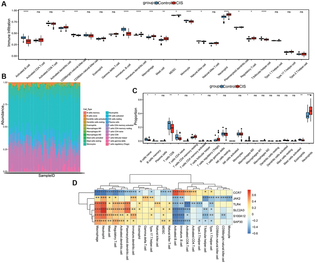 All statistical analyses were processed by R software. The limma package was used to identify DEmRNAs based on the screening criteria FDR <0.05 and |log2FC| >0.2. The Wilcoxon test was used to statistically analyze the difference of immune cell infiltration level between CIS group and normal control group. The relative expression levels of CCR7, S100A12, SAP30 and SLC2A3 were calculated using the 2−ΔΔCt method. P < 0.05 was considered significant difference.