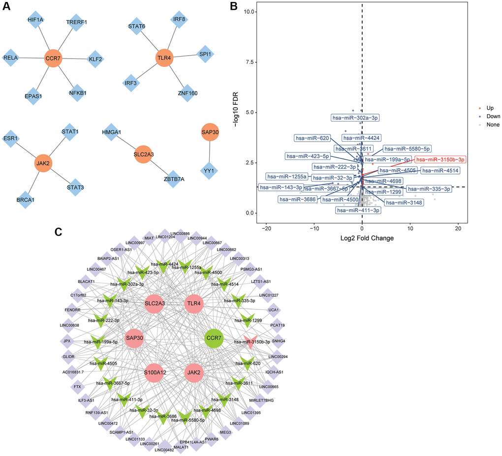 TFs related to hub mRNAs were queried based on TRRUST database, and the results were imported into Cytoscape to construct a regulatory network. The results showed that S100A12 had no related TF, CCR7 had 6 related TFs (HIF1A, TRERF1, KLF2, NFKB1, EPAS1 and RELA), TLR4 had 5 related TFs (IRF3, IRF8, SPI1, STAT6 and ZNF160), JAK2 had 4 related TFs (BRCA1, ESR1, STAT1 and STAT3), SLC2A3 had 2 related TFs (HMGA1 and ZBTB7A), and SAP30 had 1 related TF (YY1) (Figure 7A). A total of 623 targeted miRNAs were predicted for 6 hub mRNAs based on ENCORI and miRDB databases. 127 DEmiRNAs (33 up-regulated and 94 down-regulated) were obtained by differential expression analysis of miRNAs in the GSE95204 dataset (Figure 7B). Then, the intersection of DEmiRNAs negatively regulated with hub mRNAs and targeted miRNAs were screened out. 22 intersection miRNAs were obtained. The lncRNAs associated with intersection miRNAs were searched based on ENCORI database, and then the correlation between these lncRNAs and hub mRNAs was predicted. Subsequently, 42 lncRNAs associated with hub mRNAs were screened out. The correlation between CCR7 and EPB41L4A-AS1 was the highest (0.80), followed by SLC2A3 and LINC01089 (−0.67). Finally, the ceRNA regulatory network was constructed based on 42 lncRNAs, 22 intersection miRNAs and 6 hub mRNAs (Figure 7C).