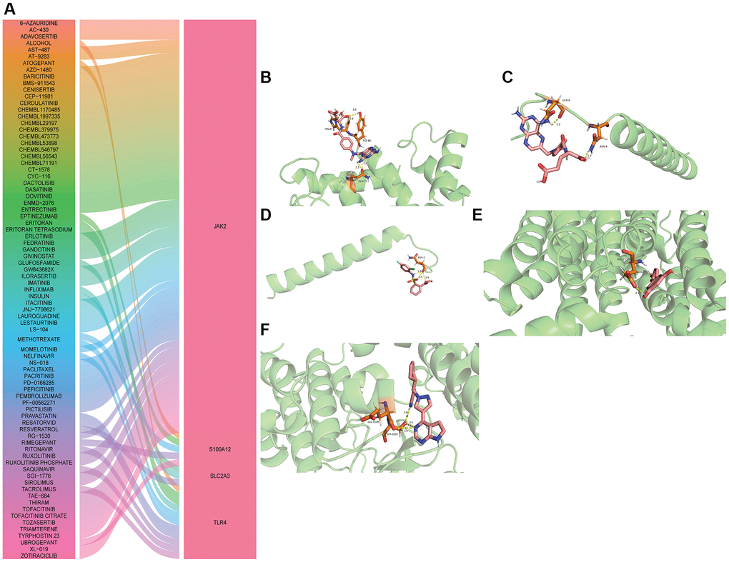 Based on DGIdb database, related drugs of hub mRNAs were predicted, but only related drugs of JAK2, S100A12, SLC2A3 and TLR4 were obtained (Figure 8A). The search of these drugs found that ruxolitinib, methotrexate, resveratrol and resatorvid play an important role in the treatment of brain injury. Subsequently, the molecular docking of ruxolitinib, methotrexate, resveratrol and resatorvid and their action hub mRNAs was performed. When the binding energy between the drug and the target protein is the lowest, it shows the best conformation and the interaction mode between the drug molecule and the target protein (Figure 8B–8F and Table 1). The lowest binding energies between drugs and target proteins were all less than −1.19423 kcal/mol, which implies that ruxolitinib, methotrexate, resveratrol and resatorvid may play a role in the treatment of diseases by acting on target genes.