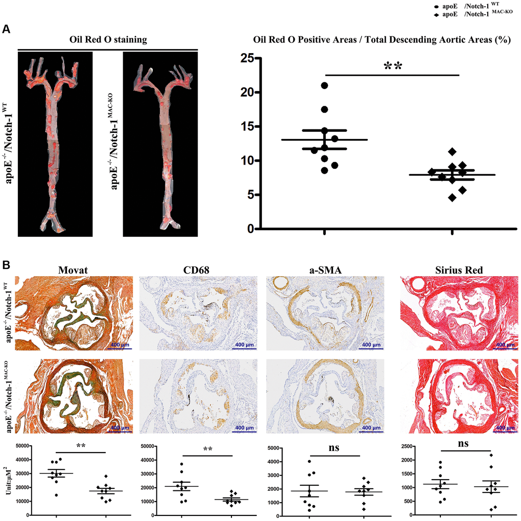 Taken together, these results demonstrate that Notch-1MAC-KO reduces M1 and enhances M2 phenotype of macrophages, and has an anti-inflammatory effect in protecting ApoE−/− mice from developing AS.