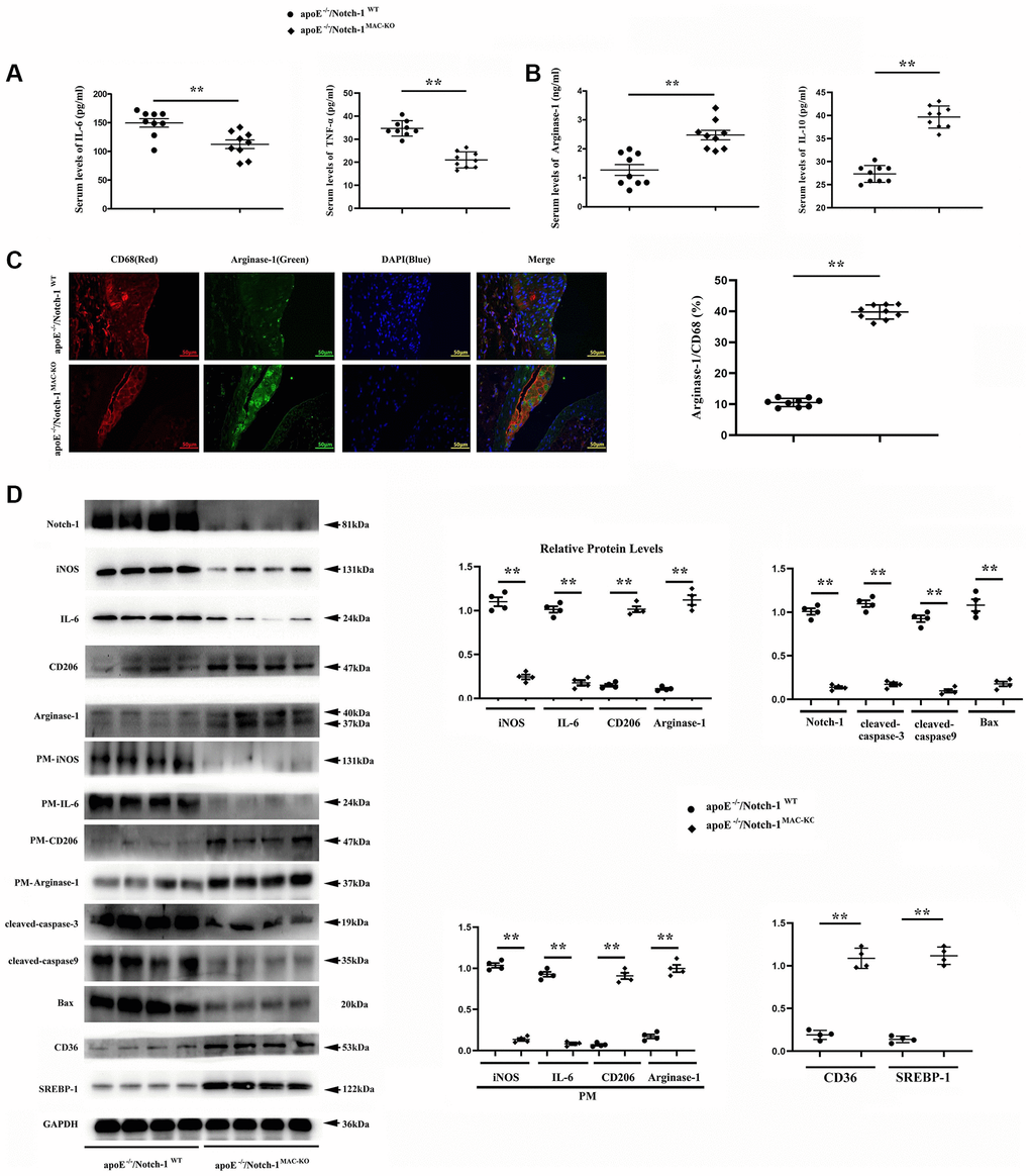 Given that macrophages are present in two major subsets of M1 and M2 macrophages, typically activated M1 macrophages intermediate pro-inflammatory responses, whereas alternatively activated M2 macrophages inhibit inflammatory responses [8]. In this study, it was verified that IL6 and iNOS (M1 markers) were significantly down-regulated in Notch-1MAC-KO mice, whereas CD206 and Arg-1 were up-regulated in Notch-1MAC-KO mice, suggesting that Notch-1MAC-KO represses pro-inflammatory (M1) responses and enhances anti-inflammatory (M2) responses, and has an anti-inflammatory effect on the development of AS.