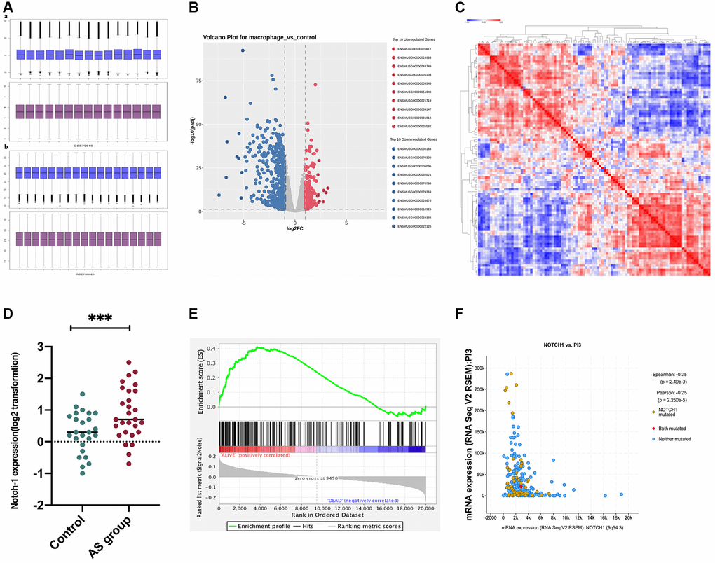 Earlier work has shown that Notch-1 knockdown increases PTEN protein levels [4], and PTEN can inhibit PI3K signaling through dephosphorylating PIP3 and producing phosphatidylinositol 4,5-bisphosphate [9]. However, the relationship between Notch-1 and PI3K signaling pathways in AS has not been investigated previously. Thus, whether there was an association between PI3K activation and Notch-1 expression in AS was detected by bioinformatics analysis. GSE155842 and GSE155745 datasets containing AS samples were downloaded from the GEO database. The gene expression levels from GSE155842 and GSE155745 were standardized using quartile division, and the pre-standardization and post-standardization data were exhibited. 670 DEGs were identified in the heat map. Furthermore, the survival analysis demonstrated that the survival time of patients with high expressions of Notch-1 was significantly shorter than those with low expressions. Notch-1 was also expressed at a high level in AS tissues (P < 0.05). Furthermore, it was found that Notch-1 was negatively associated with PI3K (P < 0.05, R < −0.3). GSEA revealed a statistically significant association between Notch-1 activation and PI3K expression, suggesting that Notch-1 activation is negatively associated with PI3K in AS.