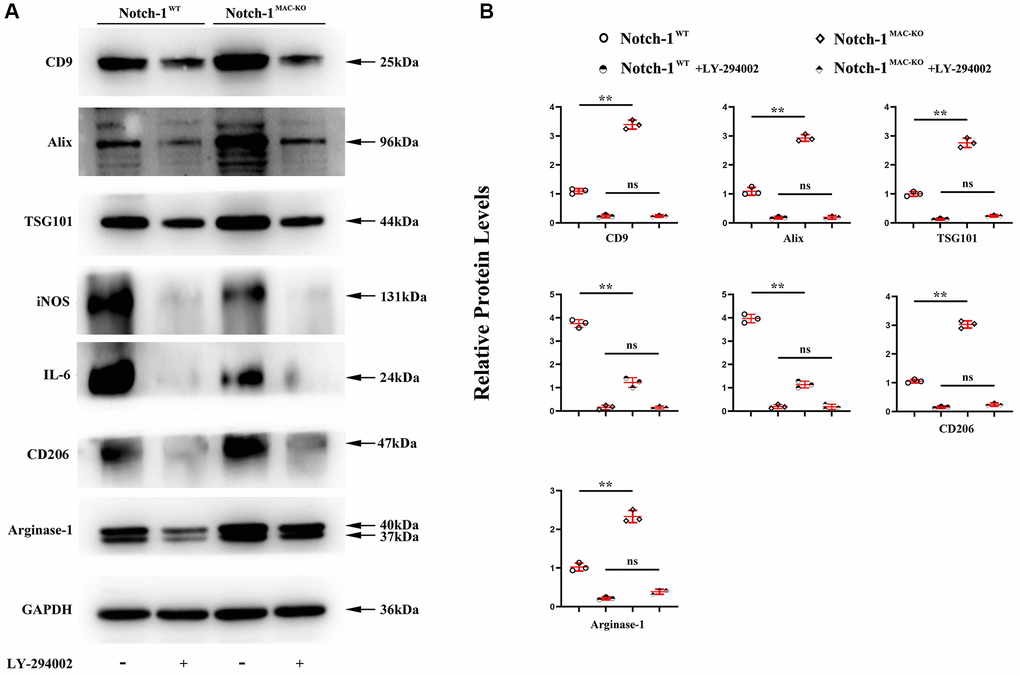 Next, an anti-PI3K neutralizing antibody LY-294002 was employed to examine the mediation role of PI3K pathway in Notch-1-derived M2 polarization. LY-294002 (10 μmol/L) was added to macrophages. As shown in Figure 5, PI3K and AKT were both inactivated in the aortic tissue of W.T. mice receiving LY-294002. Meantime, the expression of the Arg-1, an effector of PI3K/AKT activation [28], was inhibited by LY-294002. For the K.O. mice, the over-activation of PI3K and AKT was prevented, and the up-regulated expression of Arg-1, CD36, SREBP-1 reversed by LY-294002. These results suggest that Notch-1MAC-KO induced M2 anti-inflammatory effects via the PI3K/AKT pathway. Considering that exosomes serve as an important means for Arg-1 delivery [29–31], the effects of Notch-1 on exosome Arg-1 secretion through the PI3K/AKT pathway were examined. Finally, whether the peritoneal macrophages of Notch-1MAC-KO mice secreted more exosomes and induced M2 polarization was determined. Exosomes were isolated from the supernatant of peritoneal macrophages of Notch-1MAC-KO and Notch-1WT mice via ultracentrifugation. The levels of CD9, TSG101, Alix (the markers for exosomes), iNOS, IL-6, CD206, and Arg-1 were compared using Western blotting. The results showed that their expression levels were significantly enhanced in peritoneal macrophages of Notch-1MAC-KO mice, which were reversed by LY-294002 (Figure 6A, 6B), suggesting that the PI3K/AKT signaling pathway is involved in and restrains M2 polarization (r < 0.05). Compared with the W.T. group, the expression levels of CD9, TSG101, Alix, CD206 and Arg-1 were enhanced in the K.O. group, but the expression of the M1 markers iNOS and IL-6 was reversed (Figure 6B, r < 0.05). To sum up, these results implied that the PI3K/AKT signaling pathway is involved in the Notch-1MAC-KO-induced M2 polarization and further reduces the inflammatory response in AS (Figure 7).
