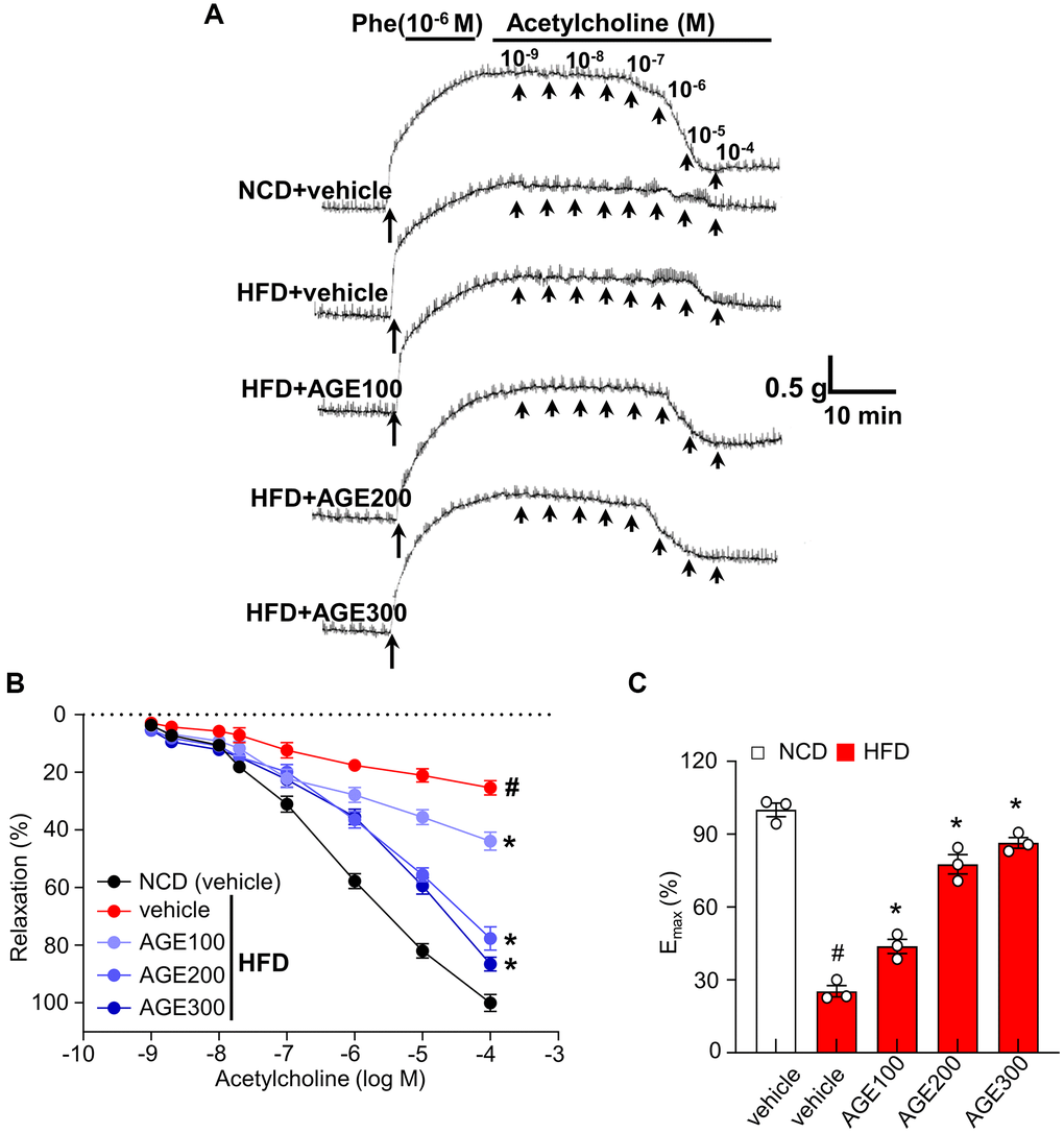 In the contractile experiment with Sprague-Dawley rat thoracic aorta rings, the aorta from normal chow diet-feeding (NCD) rats showed dramatic contraction under the 10−6 M of phenylephrine (Phe) and subsequently showed gradual relaxation under the 10−1 folded concentrations of acetylcholine (Ach) from 10−9 M to 10−4 M. The aorta from HFD rats showed significantly less contraction and relaxation than that from the NCD rats under the same procedures, whereas the aorta from AGE-administered HFD rats improved the reduced capability of contraction and relaxation in the administered AGE dose-dependent manner (Figure 1A). The vasorelaxation percentage (Figure 1B) and the maximum relaxant effect of Ach (10−4 M); a plateau vasorelaxation state (Emax) (Figure 1C) showed that AGE improved Ach-induced vasorelaxation capability, a key measurable parameter for vascular function ex vivo was significantly recovered in the administered AGE dose-dependent manner.