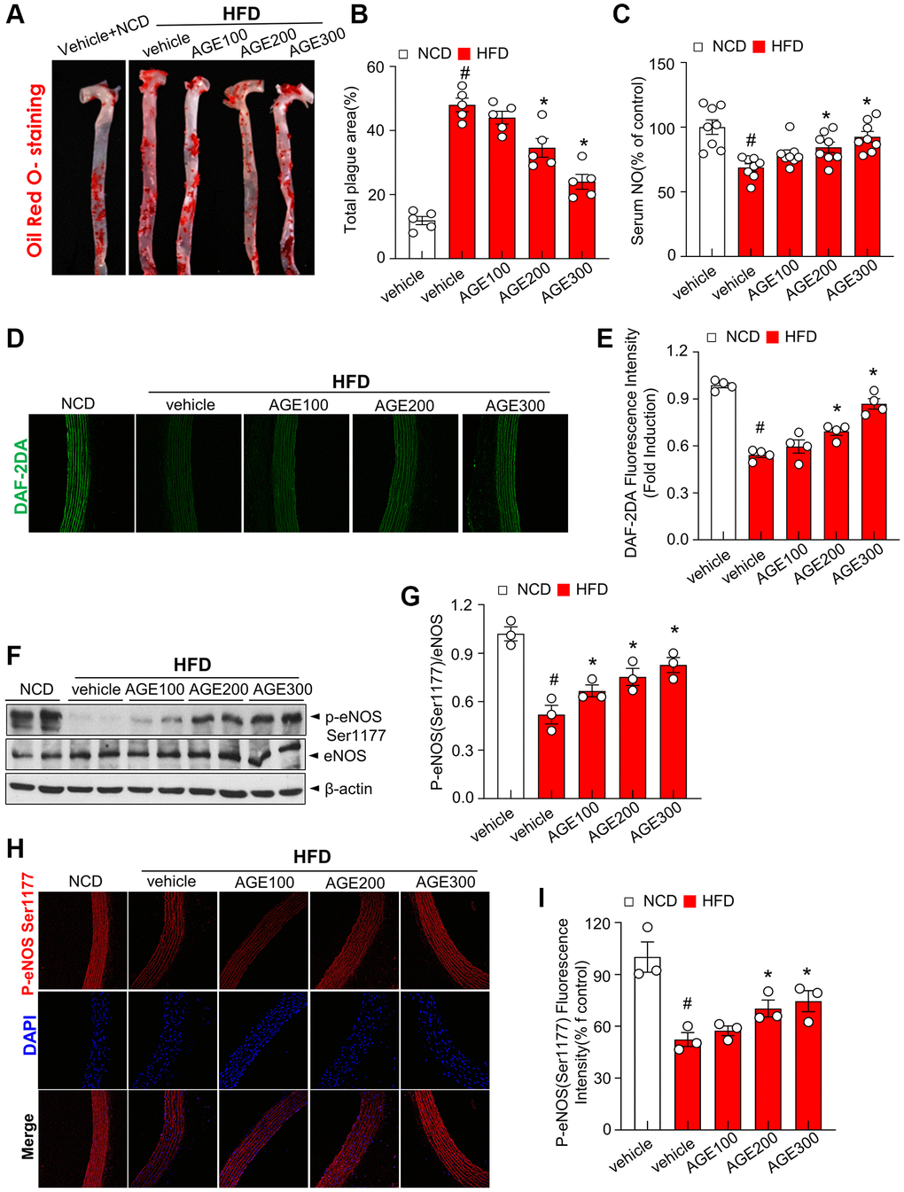 Next, we examined the effect of AGE on oxidative stress and atherosclerosis progression in HFD rats with dyslipidemia. Under the HFD condition, body weights were unaltered in the AGE-administered rats compared with vehicle-administered group (Supplementary Figure 1). Oil Red O-positive staining and total plague area, the representative ex vivo markers for oxidative stress and atherosclerosis progression, were significantly increased in the aorta from HFD rats, whereas these parameters were significantly reduced in the aorta by AGE supplementation (Figure 2A, 2B). Serum NO levels were significantly reduced in HFD groups whereas the AGE group showed higher serum NO levels compared to the HFD vehicle group (Figure 2C). The fluorescence intensity of DAF-2DA, a fluorescence dye for NO in the aorta was decreased in the aorta from HFD rats whereas the intensity was significantly recovered AGE supplementation (Figure 2D, 2E). AGE supplementation decreased the phosphorylation of eNOS at Ser-1177 whereas the phosphorylation was significantly recovered in the aorta in the HFD rats (Figure 2F, 2G). Immunofluorescence analysis also confirmed the restoration of eNOS Ser-1177 phosphorylation with AGE treatment (Figure 2H, 2I).