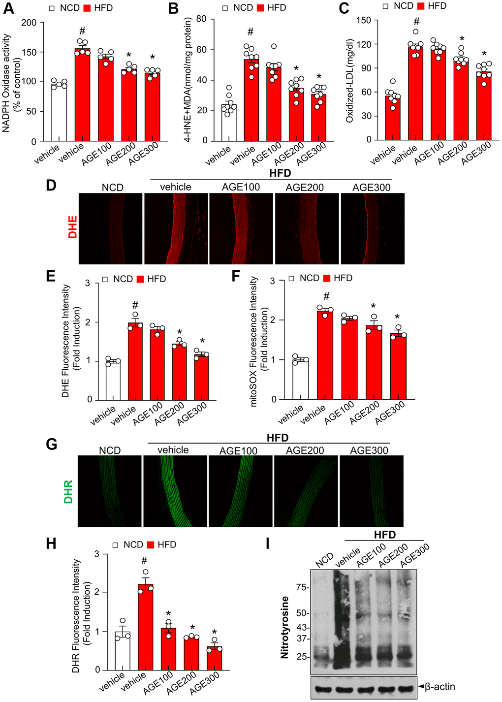 The NADPH oxidase system is a major source of ROS [19]. In the present study, NADPH oxidase activity in the HFD group was significantly higher than that in the NCD group (Figure 3A). However, AGE supplementation reversed this effect in a dose-dependent manner. Similarly, AGE reduced lipid peroxidation in the aorta from HFD rats (Figure 3B). Additionally, the production of oxidized LDL (ox-LDL), an atherosclerosis-linked ROS generator, was examined. As expected, ox-LDL was highly elevated in the HFD group and significantly decreased under the AGE supplementation (Figure 3C). After 8 weeks of treatment with AGE, serum levels of fasting glucose, TG, TC, and LDL were significantly reduced in the AGE-administered HFD group compared to the HFD-vehicle group (Supplementary Figure 2). DHE fluorescence throughout the aortic wall in the HFD group was higher than that in the NCD group whereas AGE supplementation induced a dose-dependent reduction of DHE fluorescence (Figure 3D, 3E). The MitoSox fluorescence signal, an indicator of superoxide anions [20], was increased in the aortic rings from HFD rats, whereas AGE supplementation downregulated the superoxide formation in the aortic rings (Figure 3F). The fluorescent probe DHR reacts directly with peroxynitrite-derived free radicals but not with O2− or NO [21]. The fluorescence of DHR was highly increased in the aorta from HFD group compared with NCD group whereas AGE-administered HFD group markedly reduced the levels of DHR compared with the HFD group (Figure 3G, 3H). Consistently, the nitrotyrosine level increased in the HFD condition compared with NCD condition whereas AGE administration under HFD markedly reduced the nitrotyrosine level compared with the HFD condition (Figure 3I). In contrast, aortic wall thickness was not significantly reduced in AGE-administered HFD group compared with HFD group (Supplementary Figure 3).