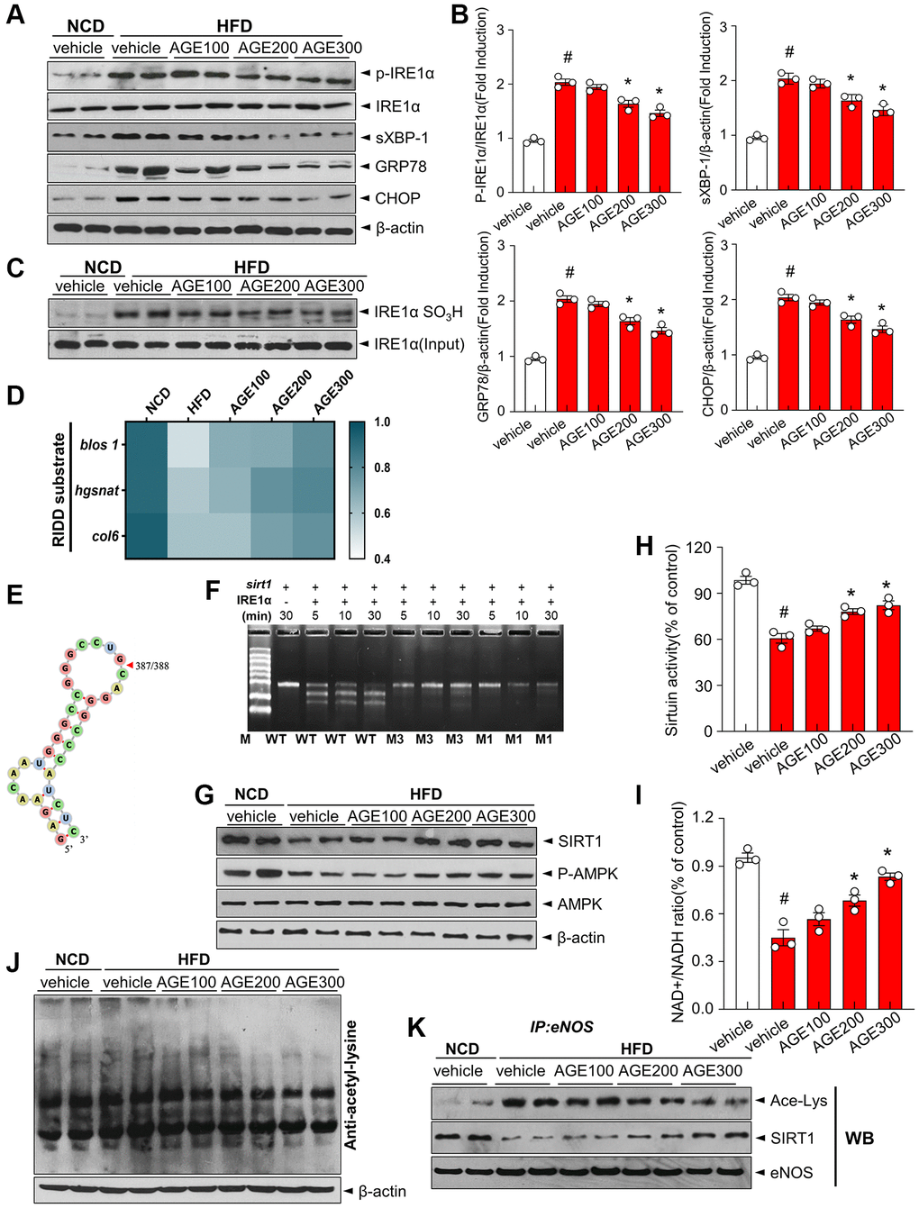 The ER stress response is a potential therapeutic target for vascular disorders [22], Hence, ER stress markers, such as p-IRE1α, sXBP-1, GRP78, and CHOP, were evaluated to determine the impact of AGE on ER stress. In the HFD group, ER stress markers were elevated, whereas AGE regulated their expression (Figure 4A, 4B). Furthermore, phosphorylation of IRE1α, subsequent XBP-1 splicing, and expressions of GRP78 and CHOP were inhibited in the AGE-treated HFD group. IRE1α sulfonation was highly increased in the HFD group whereas that was significantly inhibited in the AGE-administered HFD group (Figure 4C). Using real time PCR, we confirmed the regulated IRE1α-dependent decay (RIDD) pattern, showing the degradation of blos, hgsnat, and col6 mRNA, which was increased in the HFD group but was inhibited in the AGE-administered HFD group (Figure 4D). Sequence analysis confirmed that sirt1 contains the RIDD sequence ‘CUGCAG,’ which can form an RNA double helix (Figure 4E). Sirt1 was highly decayed in the presence of IRE1α in a time-dependent manner and the decay was inhibited in the mutants of sirt1; M1 (CUUCAG) and M3 (CUGUAG), indicating the role of sirt1 as a substrate of RIDD (Figure 4F). Consistently, SIRT1 protein expression in the HFD group was decreased compared with the NCD group. Further, the expression was recovered in the AGE-administered HFD group compared with the HFD group (Figure 4G). AMPK phosphorylation was also lower in the HFD group than in the NCD group, whereas AGE considerably recovered the phosphorylation. SIRT1 enhances eNOS enzymatic activity via deacetylation [21]. In the endothelium, SIRT1 functionally interacts with eNOS [9]. In the present study, sirtuin activity, and the mean aortic NAD+/NADH ratio were lower in the HFD group than in the NCD group (Figure 4H, 4I). However, AGE supplementation restored sirtuin activity and NAD+/NADH ratio. Furthermore, acetyl-lysine levels were significantly increased in the HFD group but were regulated by AGE (Figure 4J). Additionally, eNOS acetylation was higher in the HFD group but was controlled by AGE (Figure 4K).