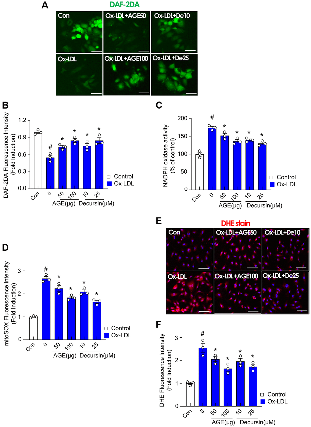 Oxidative stress was examined to understand the effect of AGE on the endothelium. Endothelial dysfunction develops due to abnormalities in NO production by the vascular endothelium [23]. In this study, a DAF-2DA probe was used to detect endothelial NO production. NO reduction by ox-LDL was reversed by AGE and decursin (Figure 5A, 5B). Similarly, AGE and decursin antagonized ox-LDL-induced NADPH oxidase activity (Figure 5C). MitoSOX fluorescence was also highly increased in ox-LDL-treated HUVECs than in the control group (Figure 5D). However, the treatment with AGE and decursin inhibited mitoSOX fluorescence. Additionally, DHE staining confirmed the inhibitory effects of AGE and decursin against ROS formation in HUVECs (Figure 5E, 5F).