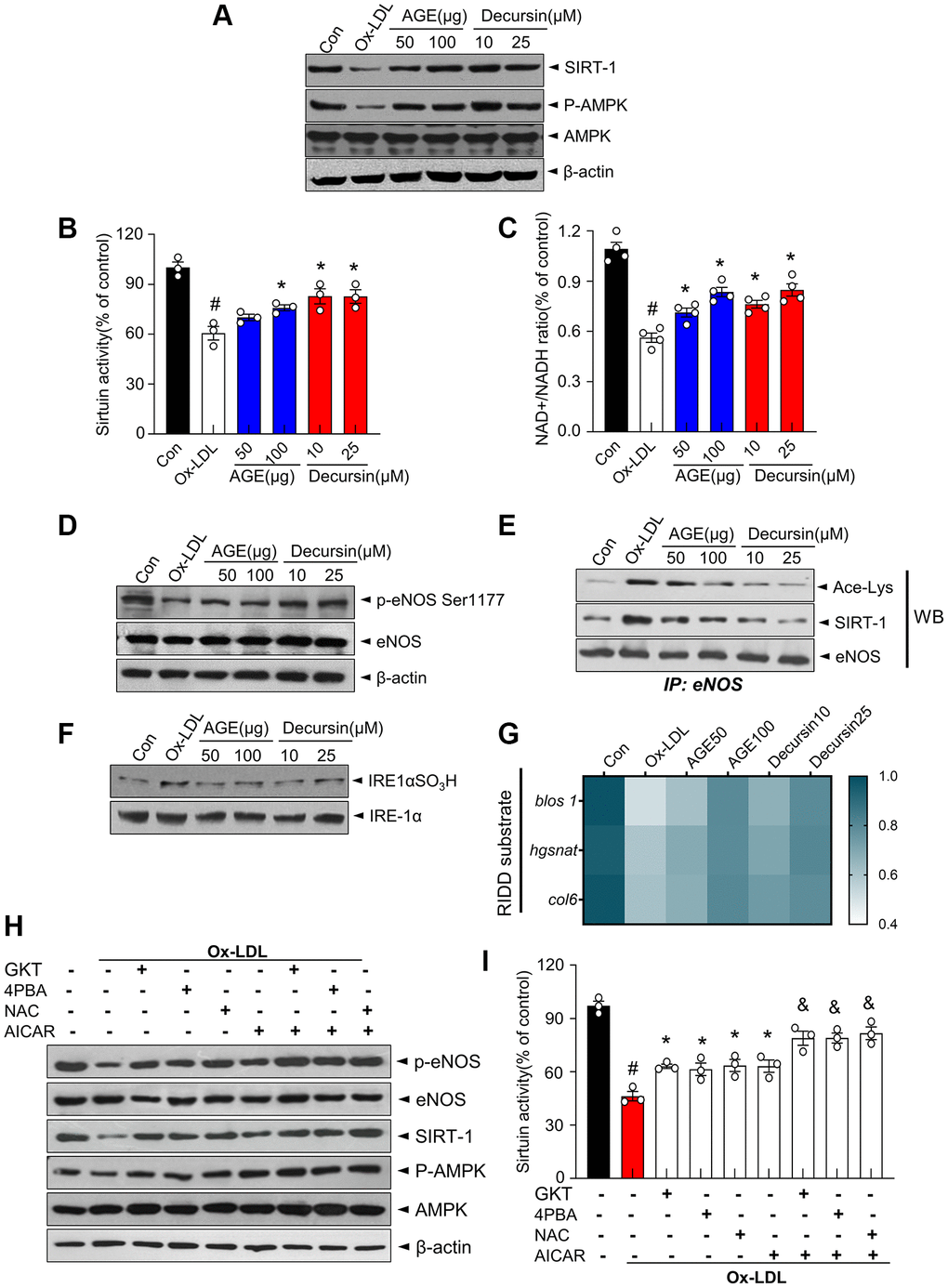 Under AGE and decursin, the expression and activity of AMPK-SIRT1 and IRE1α-RIDD/sirt1 decay signaling were examined in ox-LDL-treated HUVECs. First, AMPK phosphorylation and SIRT1 expression decreased in ox-LDL-treated cells whereas they were recovered in AGE- or decursin-treated cells (Figure 6A). Consistently, AGE and decursin restored the decreased sirtuin activity and NAD+/NADH ratio in ox-LDL-induced HUVECs (Figure 6B, 6C). Next, eNOS phosphorylation status was examined under AGE- or decursin-treated conditions. Ox-LDL significantly reduced the phosphorylation of Ser-1177, while AGE and decursin recovered the eNOS Ser1177 phosphorylation in HUVECs (Figure 6D). Furthermore, eNOS acetylation and SIRT1-associated with eNOS were significantly increased in ox-LDL-treated cells, whereas AGE or decursin decreased these levels to baseline (Figure 6E). The sulfonation of IRE1α was highly increased and the gene expressions of substrates of RIDD, blos1, hgsnat and col6 were decreased in ox-LDL-treated cells, whereas AGE or decursin restored these levels (Figure 6F, 6G). Next, ox-LDL-induced HUVECs were treated with GKT137831; Nox4 inhibitor, 4-PBA; ER stress inhibitor, N-acetylcysteine; ROS scavenger, and AICAR; AMPK activator to show the involved mechanism of AGE and decursin against endothelial dysfunction. eNOS Ser1177 phosphorylation, SIRT1 expression, and AMPK phosphorylation and sirtuin activity decreased in ox-LDL-treated cells (Figure 6H, 6I). They were partially restored by GKT137831, 4-PBA, and NAC whereas they are more significantly restored by the additional treatment of AICAR compared with the mentioned single agent-treatment, indicating ER stress and AMPK pathways are working independently on SIRT1-eNOS signaling in endothelial system.