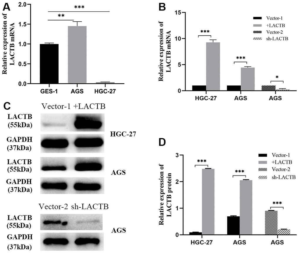 Compared to the gastric mucosal cell line GES-1, the gastric cancer cell line AGS showed significantly higher expression of LACTB transcript 1, while the undifferentiated gastric cancer cell line HGC-27 exhibited significantly lower expression of LACTB transcript 1 (P<0.05) (Figure 3A). A lentivirus overexpressing LACTB transcript 1 was used to infect AGS and HGC-27 gastric cancer cell lines to establish stable overexpression strains. An empty vector (vector 1) was used to construct corresponding empty cell lines. Meanwhile, the RNAi lentiviral vector was employed to interfere with LACTB expression in AGS, and LACTB-RNAi (67213-1) showed the most prominent knockdown effect. Thus, a stable LACTB knockdown strain was established, and Vector 2 was used to create the corresponding empty cell line. Validation at both the mRNA and protein levels confirmed the successful establishment of stable transgenic strains (P<0.05) (Figure 3B, 3D).