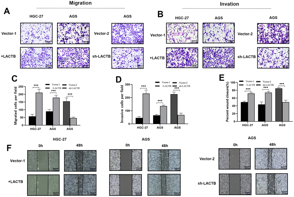 In accordance with standard laboratory practices, the pre-cooled 1640 medium was subjected to Matrigel (200μg/ml; Corning Costar, USA). Sixty microliters of this mixture were added to the upper chamber for solidification, and any excess or uncoagulated gel was subsequently removed. To introduce a total of 80,000 cells, a volume of 200 μl of cell suspension was added to the upper chamber. Meanwhile, 750 μl of medium containing 20% FBS was added to the lower chamber. Notably, the medium utilized for migration assays contained only 10% FBS, and the chamber was not coated with Matrigel. The cell chamber was then incubated under standard conditions of 37° C and 5% CO2 for a predetermined duration. After incubation, the cell chamber was removed, and 4% paraformaldehyde was employed to fix the cells for 30 minutes. Subsequently, the cells were stained with 0.1% crystal violet for 10 minutes, and the cells located on the upper layer of the filter membrane were wiped off using a cotton swab before being left to air-dry. In accordance with established protocols, the cells present in the lower filter layer were meticulously examined via a high-powered microscope. Subsequently, 5 distinct and randomly selected fields of view were meticulously assessed, and the photographs (200×) obtained were meticulously analyzed to extract the average values. The AGS cells in the LACTB overexpression group were subjected to an exhaustive 24-hour incubation process at 37° C for the invasion assay and a 20-hour incubation process for the migration assay. Conversely, the AGS cell LACTB knockdown group was subjected to a 30-hour incubation process at 37° C for the invasion assay and a 24-hour incubation process for the migration assay. Similarly, the HGC-27 cells in the LACTB overexpression group were incubated for 48 hours at 37° C for the invasion assay and 30 hours for the migration assay.