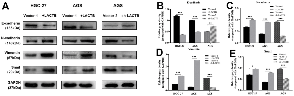 The impact of LACTB on the EMT of gastric cancer cells was assessed using Western blot analysis. The results demonstrated that the overexpression of LACTB in HGC-27 and AGS cells led to a decrease in the expression levels of the epithelial marker E-cadherin, while the levels of mesenchymal cell markers, including N-cadherin, Vimentin, and the transcription factor Snail, were upregulated compared to the control group (P<0.05) (Figure 5). AGS-sh-LACTB cells exhibited increased expression of E-cadherin, improved cell adhesion, and decreased expression levels of mesenchymal markers N-cadherin, Vimentin, and Snail, as compared to the corresponding empty vector cells (P<0.05) (Figure 5). The most significant difference was observed in the expression of Vimentin. These results suggest that downregulation of LACTB can inhibit the expression of EMT markers, promote the expression of epithelial markers, and suppress the migration and invasion of gastric cancer cells.