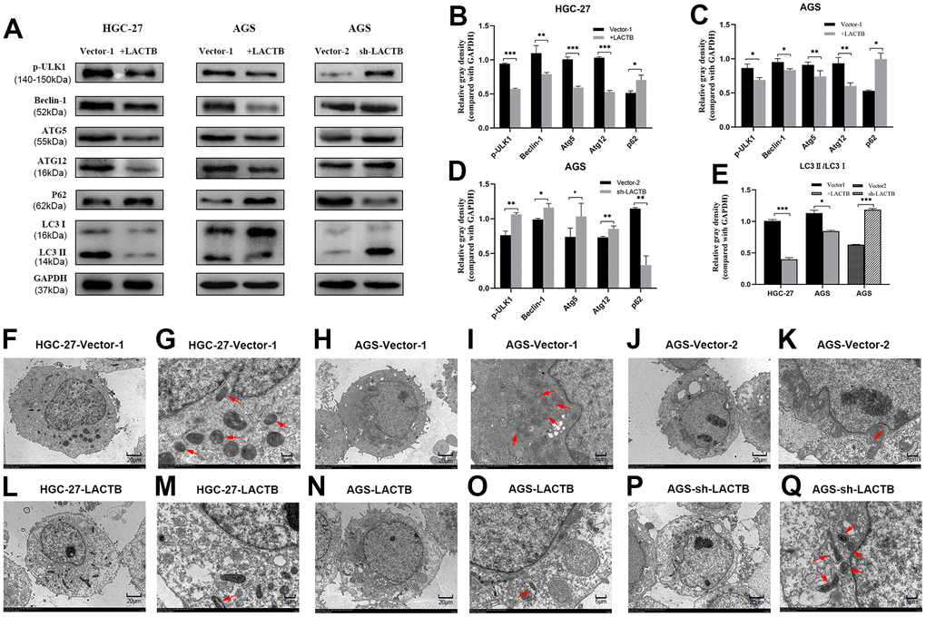 Immunoblot assay revealed that the overexpression of LACTB in HGC-27 and AGS cells led to a decrease in the expression of key proteins involved in the autophagy signaling pathway, including p-ULK1, Beclin-1, Atg5, and Atg12, as well as a decrease in the LC3II/I ratio. On the other hand, the expression level of P62 was significantly increased (P<0.05) (Figure 6A–6E). On the other hand, knockdown of LACTB led to an increase in the expression levels of key proteins p-ULK1, Beclin-1, Atg5, Atg12, and the ratio of LC3II/I in the autophagy signaling pathway, while the expression level of P62 was significantly decreased (P<0.05) (Figure 6A–6E). Further verification of the effect of LACTB on the autophagy level of gastric cancer cells was carried out using transmission electron microscopy. The results revealed that the number of autophagosomes, characterized by vacuolar bilayer membrane-like structures containing cytoplasmic components, was significantly decreased in HGC-27 and AGS cells overexpressing LACTB compared to the empty group (Figure 6F–6Q). Conversely, knockdown of LACTB in AGS cells significantly increased the number of autophagosomes, as demonstrated by transmission electron microscopy (Figure 6F–6Q). Collectively, these findings provide compelling evidence that LACTB can modulate the autophagy of gastric cancer cells by regulating the autophagy signaling pathway.