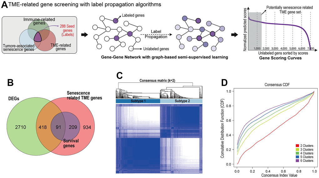 A total of 1,889 Tumor associated senescence (TAS) were selected based on well-established databases and published literature, including MSigDB (http://www.gsea-msigdb.org/gsea/msigdb/index.jsp), SenMayo gene set and, The Human Ageing Genomic Resources (HAGR) [12, 36]. The immune-related genes (N= 4,723) were downloaded from ImmPort database [37]. TME-related genes were obtained from several previously published studies and selected by removing duplicates [38]. The gene lists were expanded by searching for senescence related TME genes through network analysis with a gene-gene network since there may be genes that have not yet been investigated among the collected gene lists in this study. A gene-gene network is a weighted graph representing genes as nodes and connections between genes as edges. The edges were measured by the magnitude of the correlation coefficients, indicating the similarity between two genes in the network. Network-based label propagations were performed by employing graph-based semi-supervised learning (SSL) to investigate the potentially associated genes related to prognostic senescence, propagating label information on query nodes to unlabeled nodes along with edges [39].