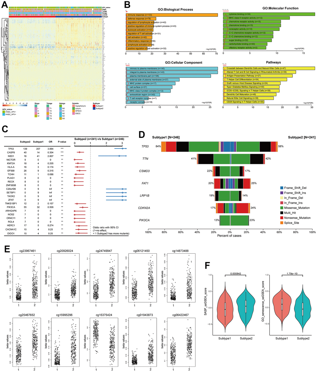 Through the application of consensus clustering using PSTGs, we identified two distinct subtypes. These subtypes exhibited significant differences in mutation profiles, methylation patterns, immune profiles reflecting the TME status, prognosis, and immunotherapy response. Subgroup 1 is more aggressive compared with tumor in subgroup 2. Interestingly, in the analysis of HNSC patients who received radiotherapy, the prognosis of patients in subgroup 1 was worse, and the difference in prognosis between subtypes increased more significantly. This observation suggests that the expression of radiation-induced senescence related genes may have implications for prognosis in the context of this study. The higher mutation rate of the TP53 gene may be implicated in subtype 1 concerning senescence related TME. The loss of p53 function promotes chromosomal instability, leading cells to undergo either senescence or apoptosis through direct and indirect mechanisms [19]. Numerous studies have indicated the significance of DNA methylation patterns in senescence as a pivotal factor influencing tumor behavior [20, 21]. In our results, subtype 1 patients had significantly hypomethylation in several CpG sites than subtype 2 patients and methylation-silenced genes in subtype 1 were enriched in transcription factor target, especially ZNF528 target genes. The data suggest that epigenetic silencing of ZNF528 could be an important factor in the determination of senescence related TME subtype in HNSC.