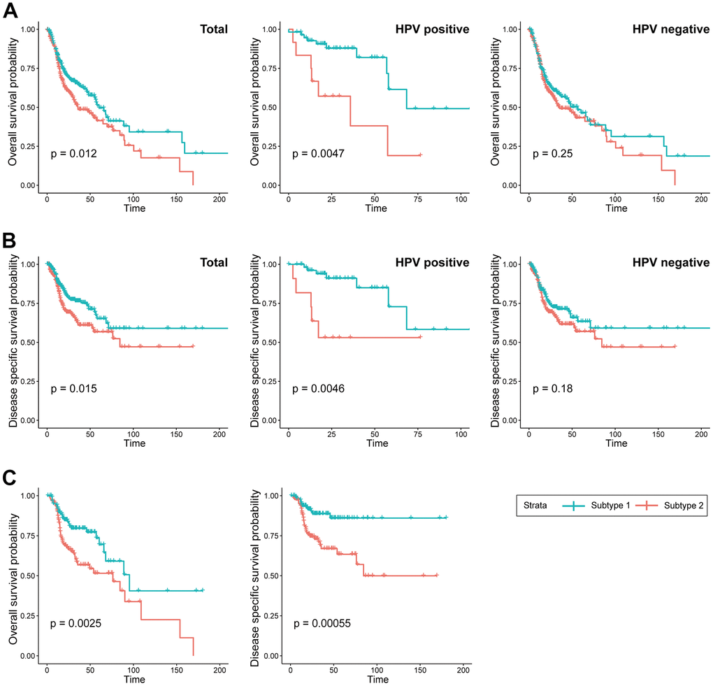 In this study, we have validated the predictive capability of the risk score obtained from STCGs across two independent cohorts. This validation emphasizes the robustness and reliability of the model based on STCGs. Notably, a significant disparity in HPV status was observed between the two classified subtypes, leading to the anticipation that our risk model would solely exhibit efficacy in HPV-positive cancer. Surprisingly, in the validation dataset (GSE41613), our developed model demonstrated prognostic capability even in HPV-negative oral cavity cancer patients. Furthermore, in the dataset comprising Asian patients (KHUMC cohort) with different ancestral backgrounds than the TCGA cohort, it was observed that the risk score differentiated the prognosis, although statistical significance was not attained.