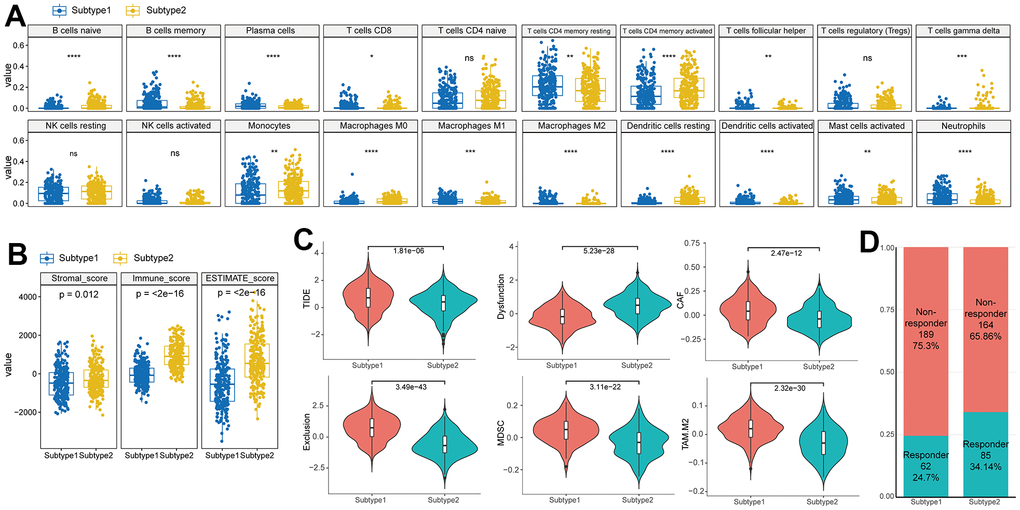 To validate the predicted treatment responsiveness, we employed the TIDE algorithm, which utilizes gene expression profiles as a computational method for predicting the efficacy of immune checkpoint blockade [45]. We also calculated the M2 tumor-associated macrophages (TAMs), tumor-associated fibroblasts (CAFs), and myeloid-derived suppressor cells (MDSCs), the dysfunction score of tumor-infiltrating cytotoxic T lymphocytes (CTLs) (T cell dysfunction), and the exclusion score of CTLs by immunosuppressive factors (T cell exclusion) through TIDE analysis.