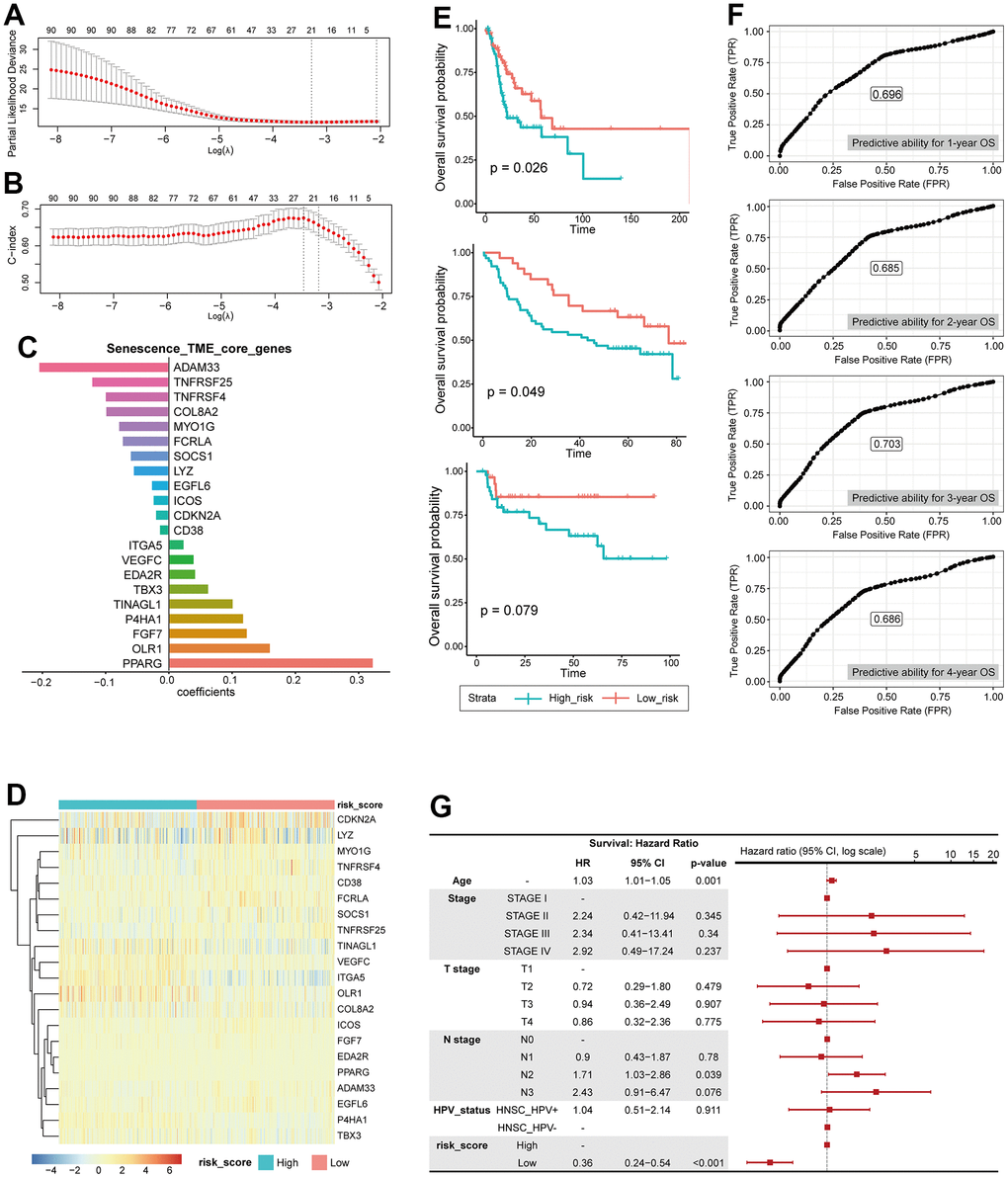 Furthermore, we established STCGs including twenty-one genes (OLR1, VEGFC, ITGA5, P4HA1, TINAGL1, TBX3, FGF7, PPARG, EDA2R, CDKN2A, ADAM33, TNFRSF4, SOCS1, TNFRSF25, MYO1G, CD38, FCRLA, EGFL6, ICOS, COL8A2, LYZ) were selected by performing the LASSO Cox regression algorithm for predicting the prognosis and therapy response of HNSC patients. Previous studies have provided some level of understanding regarding the biological functions of the genes encompassed in STCGs. Peroxisome proliferator-activated receptors (PPARs) are ligand-activated transcription factors that belong to the nuclear hormone receptor superfamily [23]. PPARG is a key regulator of lipid metabolism in diverse immune cells, thus exerting a significant influence on immune regulation [24, 25]. Notably, recent investigations have revealed an unfavorable prognostic association between overexpression of PPARG and certain cancer types (e.g., prostate cancer, esophageal cancer), particularly those linked to obesity [26, 27]. Given the highest coefficient of PPARG as a risk core gene in our findings, further exploration into the interplay between lipid metabolism and the senescence process in cancer is warranted [28]. Furthermore, consistent with our findings, previous studies have reported that OLR1 and FGF7 are associated with adverse cancer prognosis due to alterations in immune response and TME status [29–31].