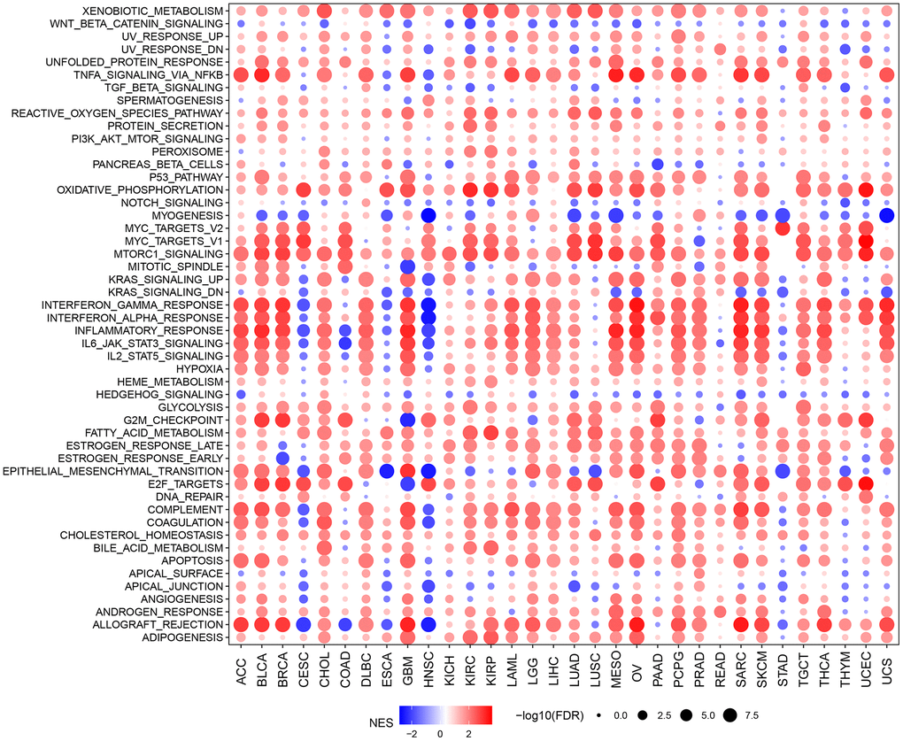 To explore the biological function roles of HOXC10 in cancers, we analyzed the correlations of the pathway’s enrichment differences with HOXC10 expression (Figure 2). We found TNFA signaling via NFKB, reactive oxygen species pathway, PI3K/AKT/MTOR signaling, P53 pathway, oxidative phosphorylation, MTORC1 signaling, glycolysis, fatty acid metabolism, hypoxia and apoptosis were totally positively enriched in HOXC10 for whole cancers. On the contrary, Notch signaling, Wnt-beta catenin signaling, myogenesis, and Hedgehog signaling were almost negatively enriched in HOXC10. Some pathways showed dual roles such as Kras signaling, interferon gram and alpha response, IL6/JAK/STAT3, IL2/STAT5 signaling were negatively enriched in HOXC10 for CESC, COAD, ESCA, HNSC but were positively enriched in HOXC10 for other cancers. Some immune-related pathways such as apical surface and junction, angiogenesis, and allograft rejection were also negatively enriched in CESC, ESCA, and HNSC.
