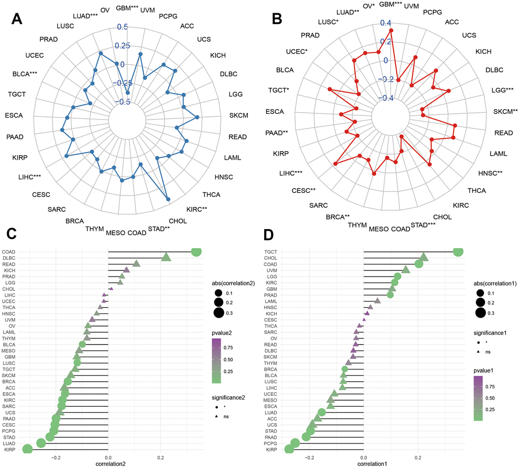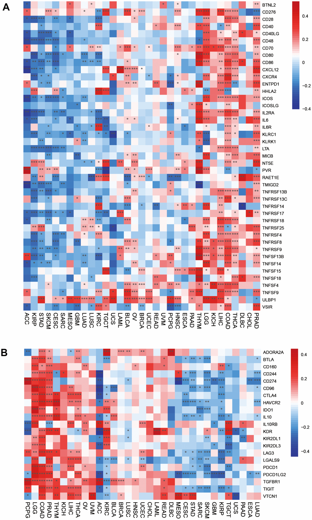 Immune-activated genes were positively associated with HOXC10 expression in THYM, LGG, KICH, LIHC, COAD, THCA, DLBC, CHOL, and PRAD. However, HOXC10 seems to inhibit these immune genes expression in ACC, KIRP, STAD, SKCM, CESC, SARC, MESO, GBM, LUAD, LUSC, KIRCT, TGCT, and UCS. For immune-inhibited genes, HOXC10 was positively associated with these genes such as CD274 in PCPG, LGG, COAD, PRAD but showed negative with CD274 in CESC, STAD, SKCM, GBM, KIRP, ESCA, and LUAD (Figure 5A, 5B).