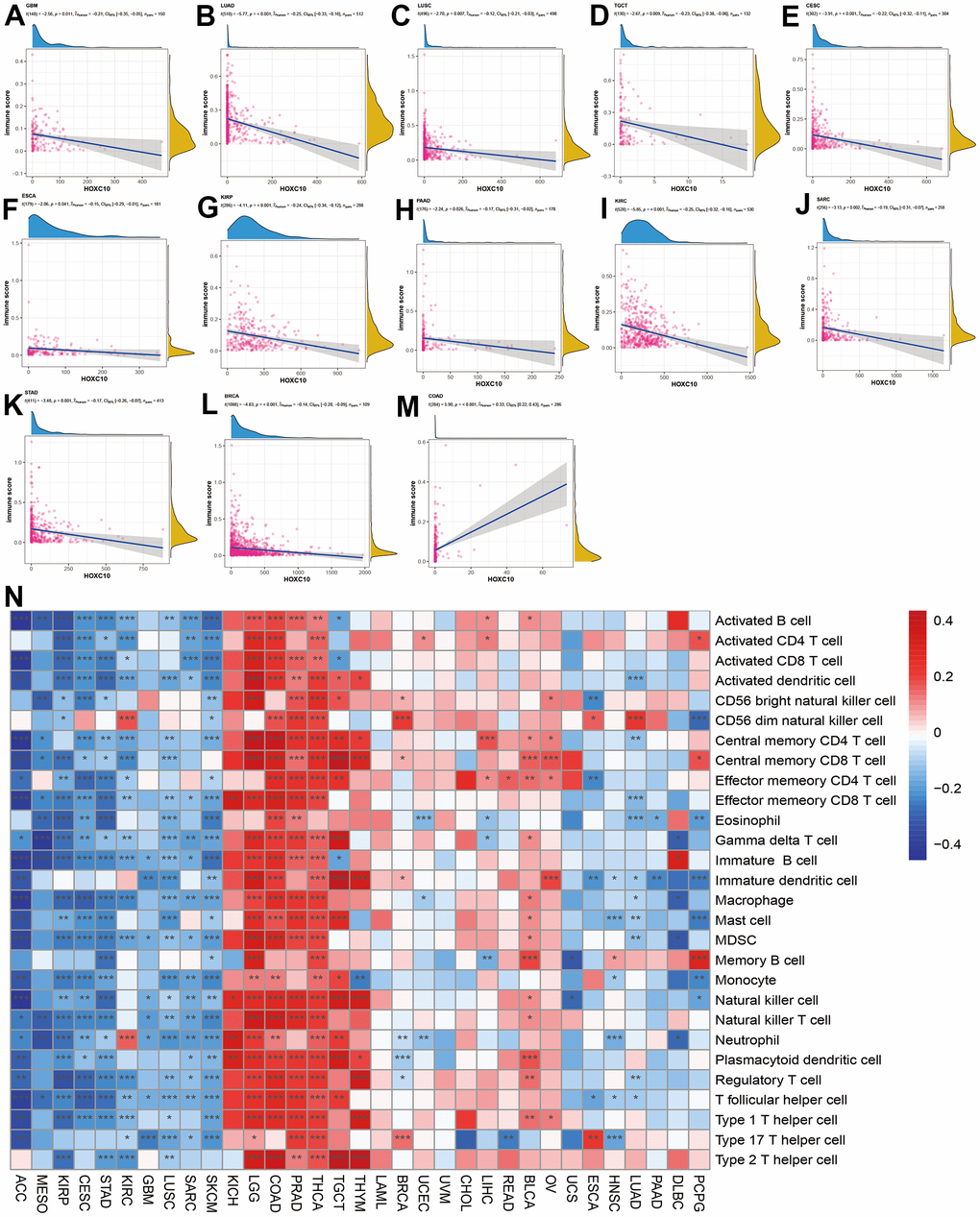 We next evaluated the correlations of HOXC10 with immune infiltration in cancers. Our results indicated that HOXC10 was almost positively correlated with all immune cells infiltration levels in KICH, LGG, COAD, PRAD, THCA, TGCT and THYM. On the contrary, these immune cells negatively infiltrated with HOXC10 in ACC, MESO, KIRP, CESC, STAD, GBM, LUSC, SARC, and SKCM. Only, neutrophil and CD56 dim natural killer cell were positively with HOXC10 in KIRC. In LUAD and HNSC, immune cells show similar trends (Figure 4N).