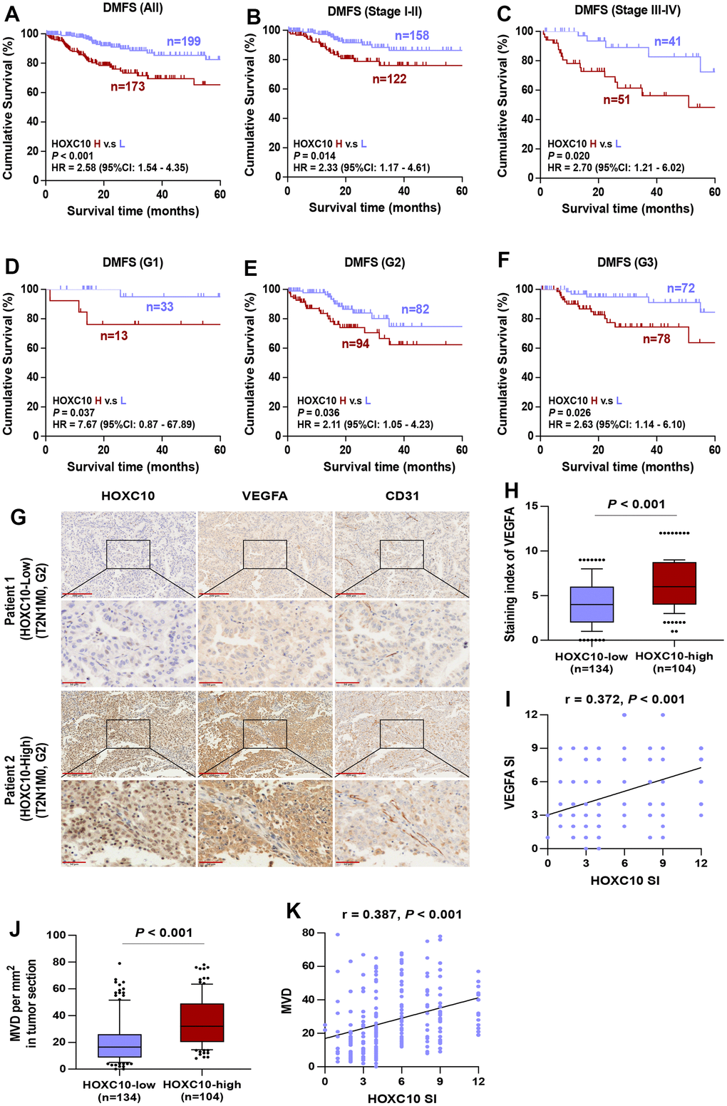 It is well known that the grade and stage of advanced tumors are significantly associated with the accelerated development of LUAD. Our statistical data indicated that elevated HOXC10 expression was positively correlated with pathological grade, N classification, M classification and clinical stage (Table 1). Furthermore, to analyze the effect of tumor stage and grade in LUAD patients with overexpressed HOXC10 on poor DMFS, LUAD patients were first stratified into different groups of Stage I to IV and Grade I to III. As shown in Figure 8A–8C, based on Kaplan-Meier survival analysis, high expression of HOXC10 exhibited poorer DMFS of LUAD patients with all Stage, Stage I-II, and Stage III-IV. Consistently, LUAD patient with high level of HOXC10 predicted shorter DMFS in the same pathological grade compared with low levels of HOXC10 (Figure 8D–8F). Collectively, these results demonstrated that the HOXC10 overexpression was significantly positively correlated with advanced progression and poor prognosis in LUAD patients.
