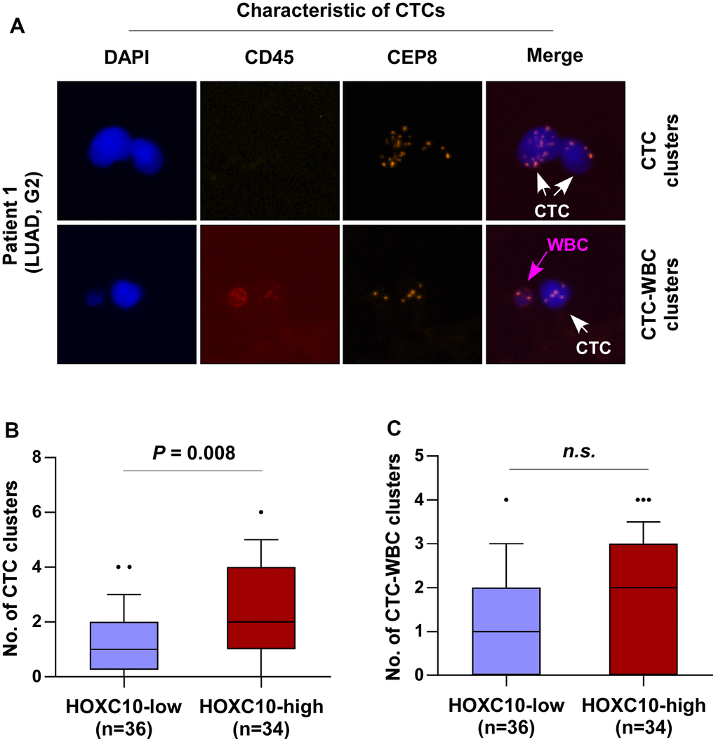 The invasion of circulating tumor cells (CTCs) into peripheral blood represents a critical process to tumor metastasis, progression, and angiogenesis. Therefore, the clinical correlation of HOXC10 expression with the number of CTC clusters in LUAD patients was further analyzed. Immunofluorescence staining of CD45 and DAPI and iFISH with centromeres of chromosome 8 (CEP8) were used to identify CTCs in patients with LUAD. CD45-/CEP8 >2 cells were defined as CTCs, while CD45+/CEP8 = 2 cells were defined as white blood cell (WBC) (Figure 9A). We found that the number of CTC clusters in LUAD patients with high levels of HOXC10 (n= 34) was more than that in those with low levels of HOXC10 (n= 36) (Figure 9B). While the number of CTC-WBC clusters between them was no significant difference (Figure 9C). Our results indicated that HOXC10 expression levels is positively correlated with the number of CTC clusters in LUAD patients.