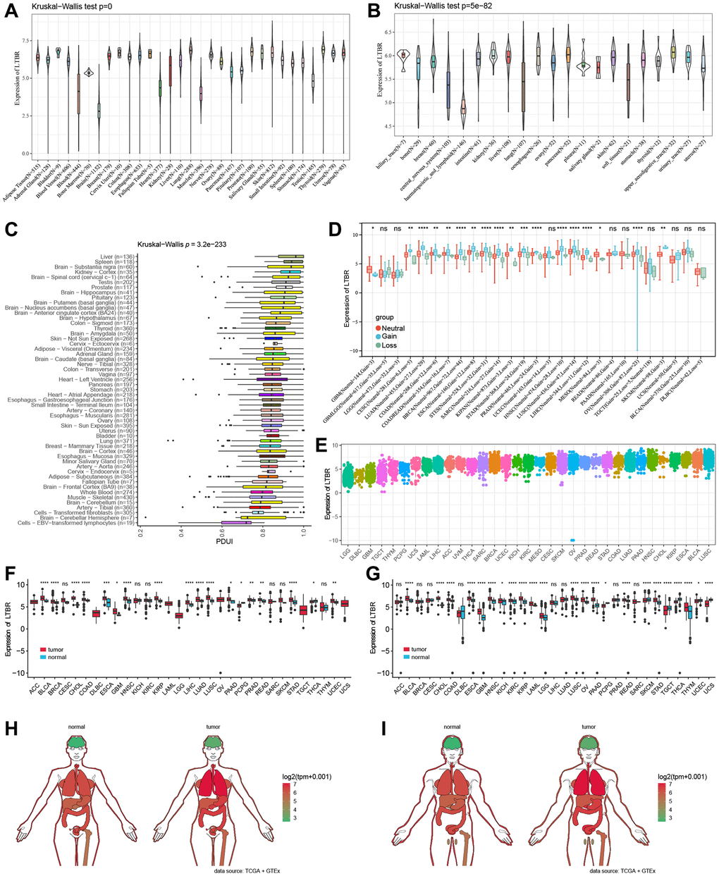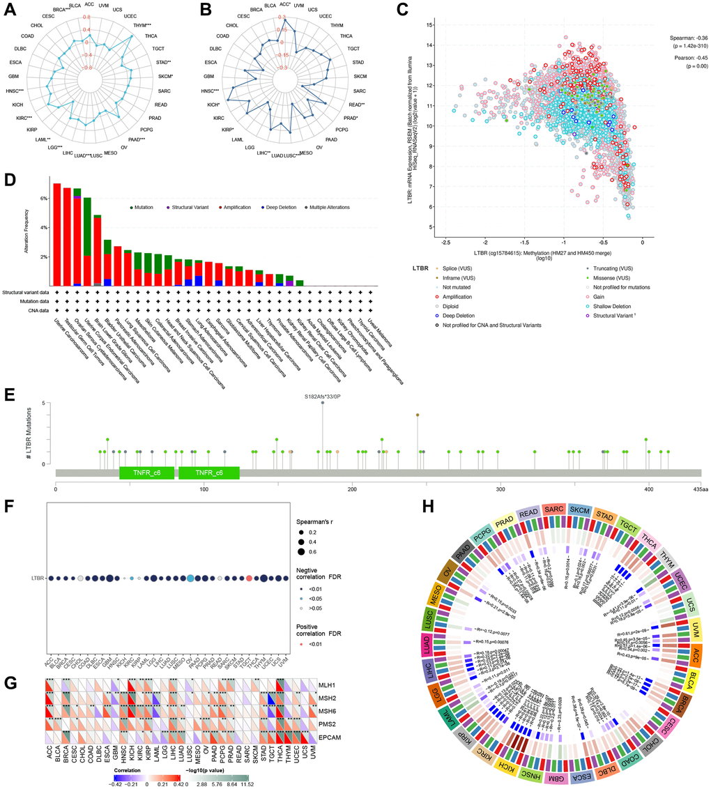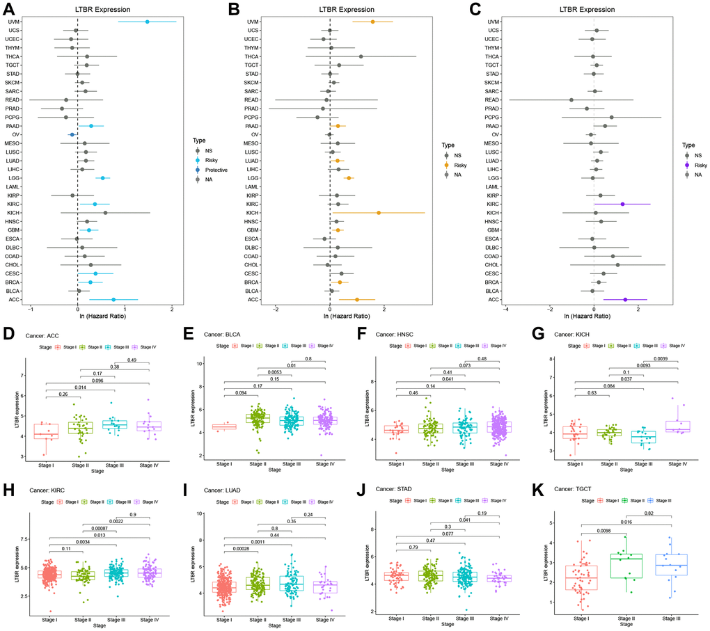 In this study, we conducted a comprehensive analysis of LTBR expression, its prognostic implications, and its associations with clinical staging, immune subtypes, and molecular subtypes. We also investigated the relationship between LTBR and immunomodulatory genes, immune checkpoint genes, RNA modification genes, immune cell infiltration score, immune cells, DNA mismatch repair (MMR) genes, and DNA methylation transferases. Additionally, we explored the correlation between LTBR and cancer-related functional status at the single-cell level. The impact of LTBR on DNA methylation, mutational status, tumor mutational burden (TMB), and microsatellite instability (MSI) was examined. To uncover cancer-associated pathways associated with LTBR expression, we utilized Gene Ontology (GO), Kyoto Encyclopedia of Genes and Genomes (KEGG), and gene set enrichment analysis (GSEA). In addition, we also analyzed LTBR at the pan-cancer level to drug sensitivity.