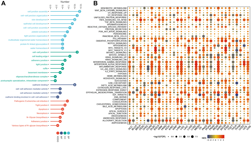 The GO analysis revealed significant enrichment of genes in processes related to cell junction assembly, cell-cell junction organization, skin development, cell-cell junction, cell leading edge, cadherin binding, and cell-cell adhesion mediator activity (Figure 10A); The KEGG analysis revealed a significant increase in genes associated with Pathogenic Escherichia coli infection, Tight junction, apoptosis, necroptosis, N-Glycan biosynthesis, Adherens junction and Various types of N-glycan biosynthesis. GSEA results showed that in most tumors, tnfa_signaling_via_nfkb, p53_pathway, oxidative_phosphorylation, interferon_gamma_response, interferon_alpha_response, inflammatory_response, epithelial_mesenchymal_transition, and coagulation were activated (Figure 10B).