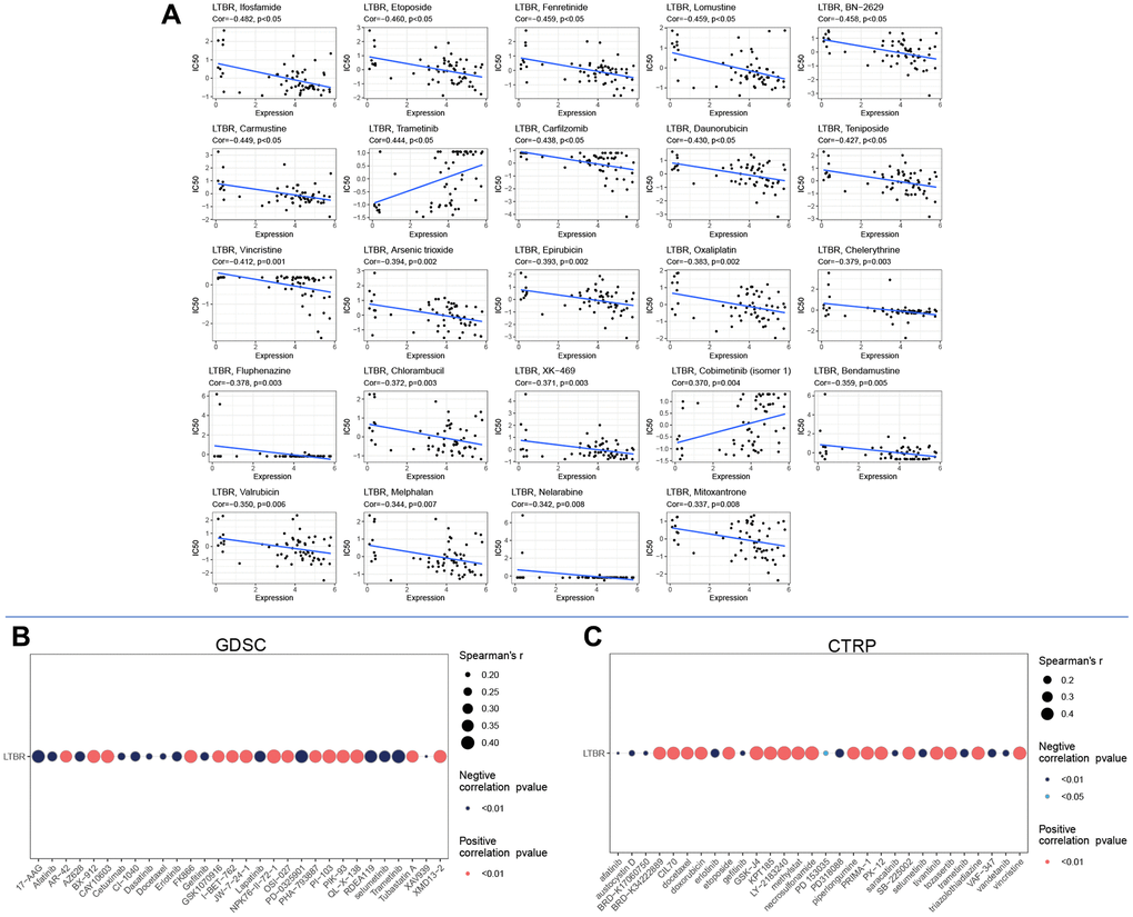The expression of LTBR displayed a significant negative correlation with 22 drugs and a significant positive correlation with two drugs (Figure 11A). In addition, based on the GDSC (Figure 11B) and CTRP (Figure 11C) results, we identified multiple drugs significantly positively correlated with LTBR, which expands the scope of developing potential drugs targeting LTBR.