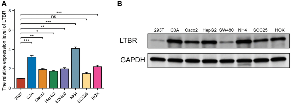 A selection of normal (293T, HOK) and cancerous (C3A, Caco2, HepG2, SW480, NH4, SCC25) cell lines were utilized to detect the expression of LTBR, identified as a key risk gene in previous screenings. We began by validating the expression of LTBR at the transcriptome level using real-time quantitative polymerase chain reaction (RT-qPCR). It was found that LTBR exhibited a higher degree of expression in cancer cell lines compared to normal ones, yet this expression was notably absent in certain hepatoma cells (Figure 12A). Subsequently, the expression of the associated proteins was confirmed in the aforementioned cell lines at the proteomic level via Western blotting (Figure 12B). The data indicated that these proteins were relatively overexpressed in more cancer cell lines.