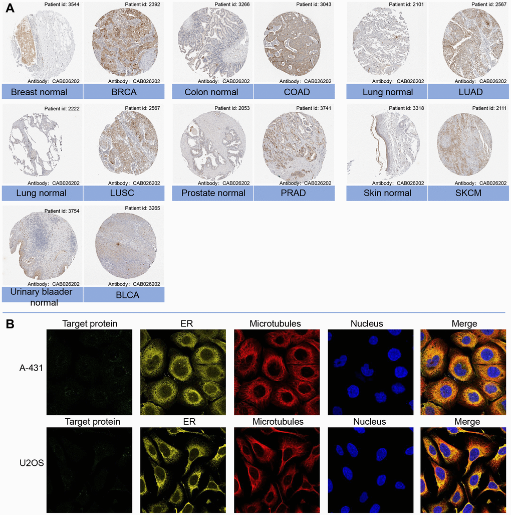The mRNA expression levels of LTBR were examined in various organs using data from the GTEx database, which encompassed diverse tissues from healthy individuals (Figure 1A). In making comparisons between tumor cell lines, we found that LTBR had high expression levels in the upper aerodigestive tract, pancreas and kidney tumor cell lines, as well as low expression levels in the central nervous system, haematopoietic and lymphoid tumor cell lines (Figure 1B). The findings indicated that LTBR expression was relatively consistent across different tumor cell lines. Figure 1C depicts the alternative polyadenylation (APA) profile of LTBR in each normal tissue. We looked at how much LTBR was expressed in each tumor. By analyzing copy number data and gene expression data in the samples, we observed significant differences in 18 tumors (Figure 1D). The results showed that LTBR had the highest LUSC, BLCA, and ESCA expression levels and the lowest in LGG, DLBC, and GBM (Figure 1E). Subsequently, the expression levels of LTBR in tumor and normal tissues were assessed utilizing data from the TCGA database. The analysis unveiled a significant upregulation of LTBR expression in 16 different cancer types (Figure 1F). Next, we integrated the GTEx database to compare LTBR expression between tumor tissues and normal tissues across 27 different types of cancer. The analysis demonstrated that LTBR exhibited increased expression levels in 17 cancer types, suggesting its potential role as an oncogene in these specific cancers (Figure 1G). Subsequently, we examined the expression patterns of LTBR in active body maps using the GEPIA dataset, which revealed distinct expression differences between tumor tissues and their corresponding normal tissues (Figure 1H, 1I). To further validate these findings, IHC results of BRCA, COAD, LUAD, LUSC, PRAD, SKCM, BLCA, and normal tissues were examined (Figure 2A), which consistently showed high expression of LTBR in various tumors. The cancer cells’ immunofluorescence (IF) images indicated that LTBR is mainly located in the Golgi apparatus (Figure 2B). Figure 2A, 2B available from https://www.proteinatlas.org/search/LTBR.