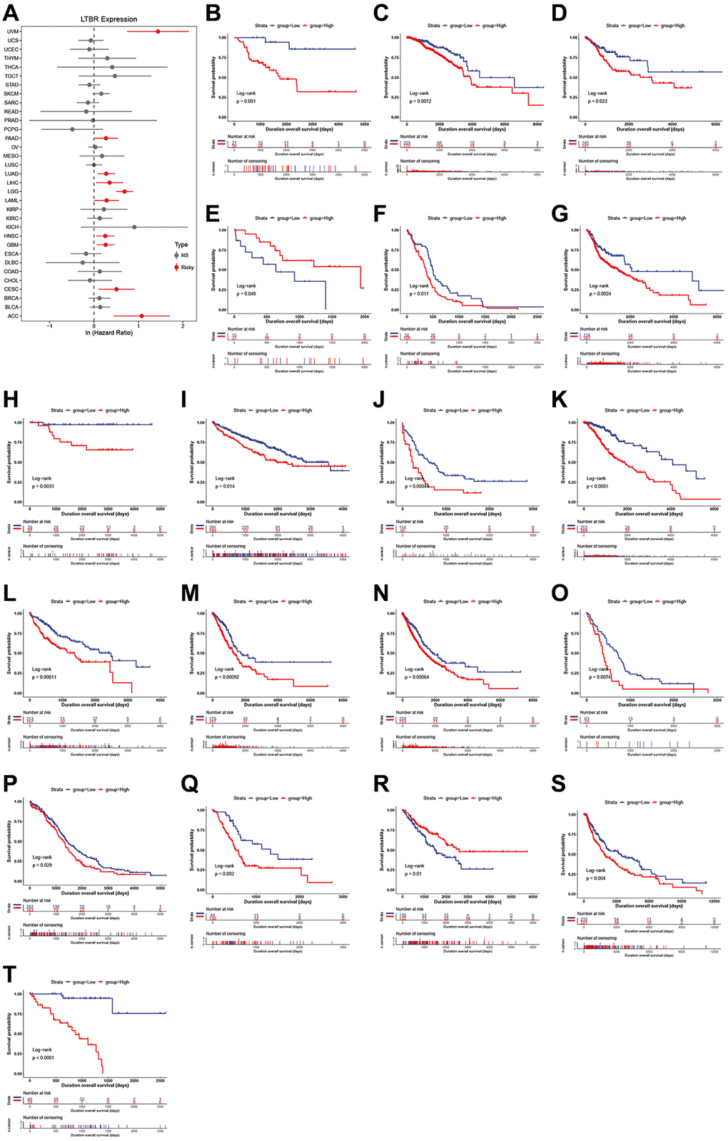 Log-rank test analysis and univariate Cox regression (UniCox) analysis were used to explore the effect of LTBR on patient survival in pan-cancer. Many studies frequently use them to establish the predictive profile of tumor-associated biomarkers [80–82]. Log-rank test analysis was used to assess the effect of LTBR on overall survival (OS). UniCox analysis was used to determine OS, disease-specific survival (DSS), the disease-free interval (DFI), and the progression-free interval (PFI).