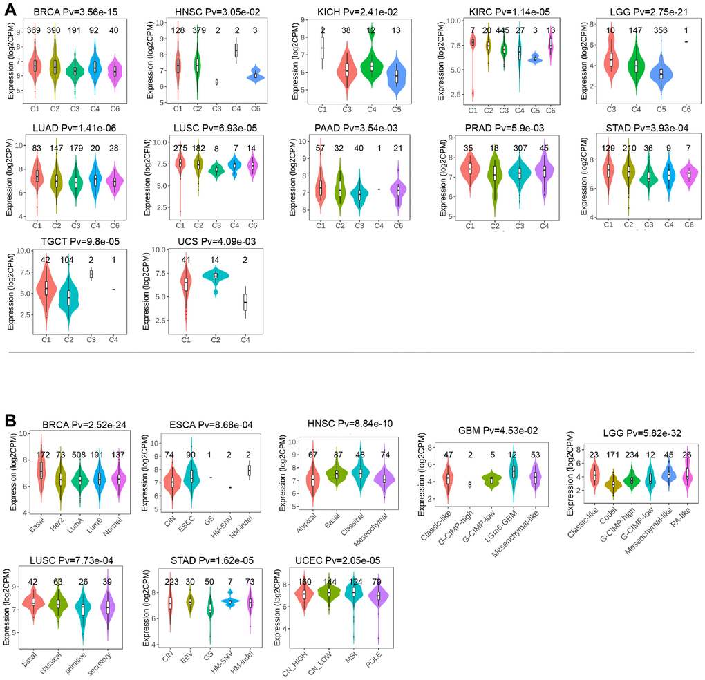 Moreover, we examined the expression of LTBR across various stages of different cancers according to WHO classification. Our analysis revealed that LTBR exhibited elevated expression in advanced stages of ACC, HNSC, KICH, KIRC, LUAD, and TGCT, while demonstrating lower expression in higher stages of BLCA and STAD (Figure 4D–4K). LTBR showed significant associations with immune subtypes in 12 tumors (Figure 5A). Regarding molecular subtype, LTBR was substantial in 8 tumors (Figure 5B).