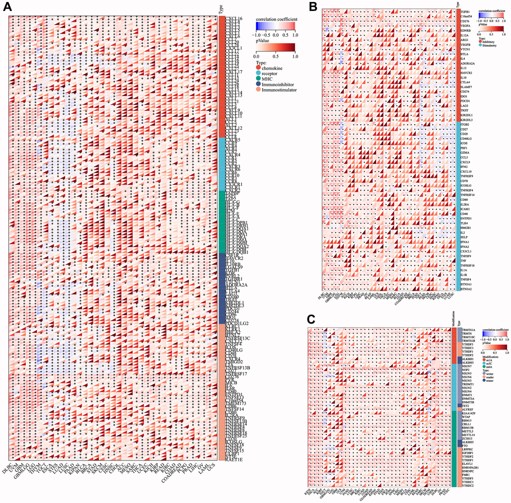 LTBR was positively correlated with immunomodulatory genes in most tumors. LTBR exhibited a positive correlation with CXCL16, CXCL8, CXCL3, CXCL2, CXCL6, CCL20, TAPBP, TAP1, TAP2, HLA-G, HLA-B, IL10RB, LGALS9, TGFB1, KDR, PVRL2 TGFBR1, CD276, PVR, MICB, IL6, IL6R, C10orf54, TMEM173, TNFRSF14, TNFSF9, TNFSF15, ULBP1, NT5E, and RAET1E had significant positive correlations in most tumors (Figure 6A). In terms of immune checkpoint genes, LTBR had significant positive correlations with TGFB1, C10orf54, CD276, VEGFA, EDNRB, CX3CL1, TNFSF9, TNF, TNFRSF18, IL1A, IL1B, TNFSF4, BTN3A1, BTN3A2, and HMGB1 in most tumors (Figure 6B). In the majority of tumors, LTBR displayed significant correlations with m1A, m5c, and m6A-related genes (Figure 6C).