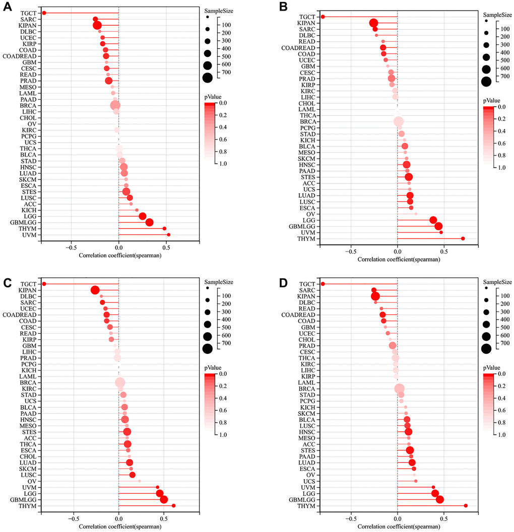According to the results of DMPss (Figure 8A), DNAss (Figure 8B), ENHss (Figure 8C), and EREG-METHss (Figure 8D), the correlation between LTBR and stemness index was consistent across multiple tumors, such as LTBR was significantly positively correlated with TGCT, SARC, KIPAN, DLBC, UCEC, KIRP, and COAD, significantly negatively correlated with STES, LUSC, ACC, KICH, LGG, GBMLGG, THYM, and UVM.