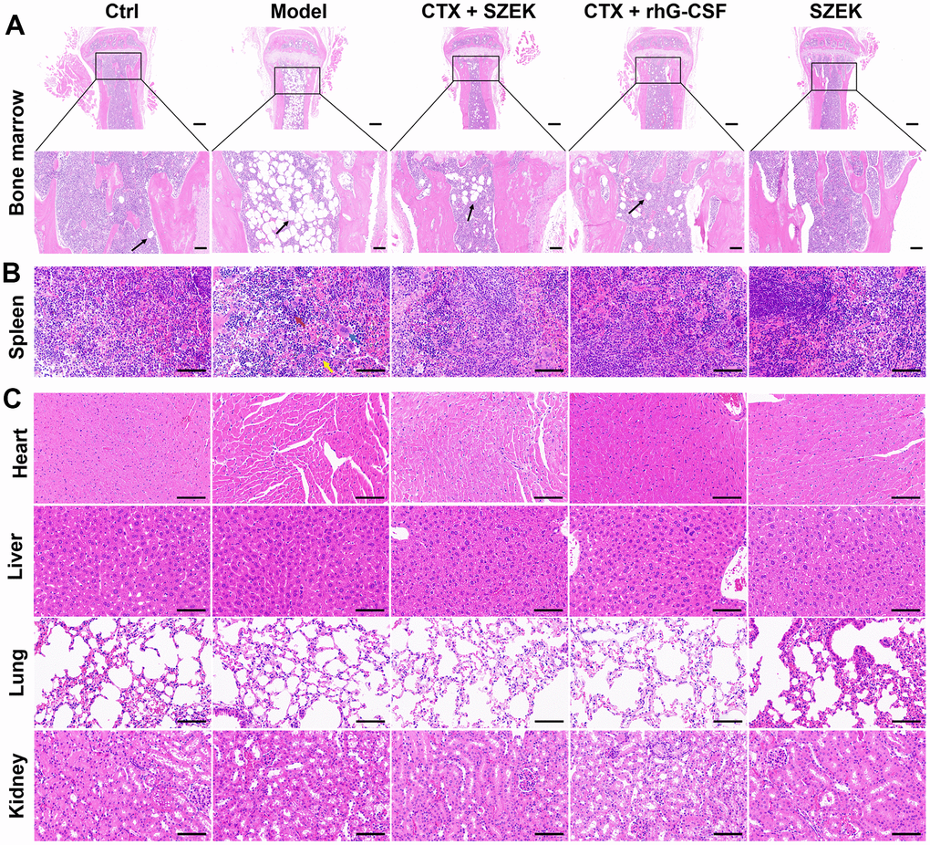 The bone marrow and spleen are active hematopoietic tissues in mice [21]. Histopathological changes in the bone marrow and spleen tissues were confirmed via hemeatoxylin and eosin (H&E) staining. Compared with normal mice, the Model group of mice administered CTX exhibited a highly abnormal bone tissue structure, with a prominent reduction in the number of bone trabeculae in the bone marrow cavity and heavy steatosis of the bone marrow cells. This resulted in the generation of a large number of adipocytes and consequently a reduction in the number of bone marrow cells, which was ameliorated by the administration of SZEK and recombinant human granulocyte colony-stimulating factor (rhG-CSF) (Figure 1A). Furthermore, SZEK and rhG-CSF alleviated the structural disorganization of splenic nodules, considerably reduced the number of lymphocytes, and substantially increased the number of multinucleated macrophages as well as neutrophil infiltration in the spleen of mice with hematopoietic dysfunction (Figure 1B). When administered alone, SZEK did not affect the bone marrow or spleen of the mice (Figure 1A, 1B), and no significant changes were observed in the heart, liver, lung, or kidney of any group (Figure 1C). This demonstrates the protective effect of SZEK in curing CTX-induced bone marrow and spleen injuries.