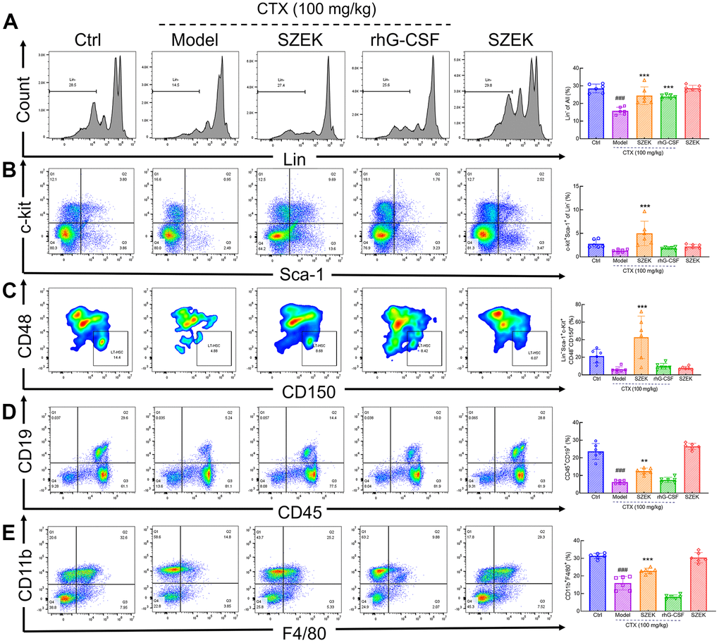 The number of hematopoietic-associated cells in the bone marrow is one of the indicators that directly evaluates the hematopoietic function of the organism [4, 22]. CTX had an inhibitory effect on the myeloid population including naïve cells (Lin−), HSCs (Lin−Sca-1+c-Kit+), LT-HSCs (Lin−Sca-1+c-Kit+CD48−CD150+), B lymphocytes (CD45+CD19+) and macrophages (CD11b+F4/80+) compared with normal mice (Figure 2A–2E). Following SZEK administration, the numbers of naïve cells, HSCs, LT-HSCs, B lymphocytes, and macrophages significantly increased by 54.97% (P<0.001), 279.57% (P<0.001), 597.90% (P<0.001), 100.00% (P<0.01), and 43.66% (P<0.001) (Figure 2A–2E), respectively, in bone marrow of mice with hematopoietic dysfunction, suggesting that SZEK can enhance hematopoiesis in mice by promoting the proliferation of bone marrow hematopoietic cells.