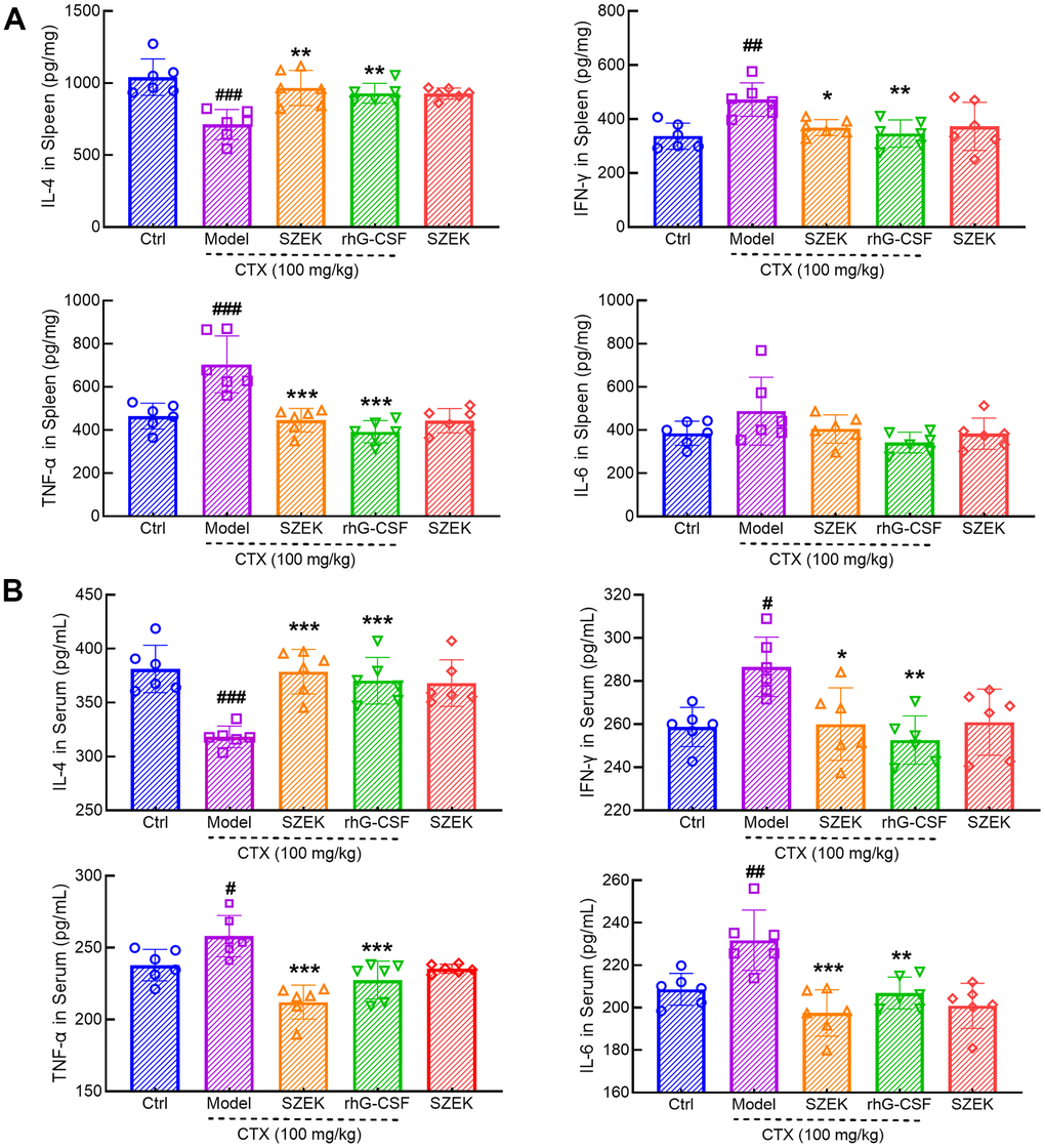 Inflammatory signaling regulates the development and homeostasis of HSCs and hematopoietic progenitor cells (HPCs) and is critical for the hematopoietic system [23]. In mice with hematopoietic dysfunction, the levels of IL-4 in the spleen were significantly decreased by 31.55% (P<0.001) whereas that of interferon (IFN)-γ, TNF-α, and IL-6 was increased by 40.29% (P<0.01), 51.62% (P<0.001), and 26.56%, respectively (Figure 3A). SZEK treatment increased IL-4 levels by 35.60% (P<0.01), and decreased IFN-γ, TNF-α, and IL-6 levels by 21.96% (P<0.05), 36.74% (P<0.001), and 16.96%, respectively, in the spleen of mice with hematopoietic dysfunction (Figure 3A). Similarly, a significant decrease in IL-4 by 16.53% (P<0.001) and increases in IFN-γ, TNF-α, and IL-6 levels by 10.75% (P<0.05), 8.49% (P<0.05), and 11.08% (P<0.01), respectively, were observed in the serum of mice with hematopoietic dysfunction (Figure 3B). Following SZEK treatment, serum IL-4 levels increased by 19.02% (P<0.001) and serum IFN-γ, TNF-α, and IL-6 levels decreased by 9.24%, 17.80%, and 14.80%, respectively (P<0.05, Figure 3B). The results of enzyme-linked immunosorbent assay (ELISA) indicate that SZEK can reduce inflammation in the spleen and serum of mice with hematopoietic dysfunction.