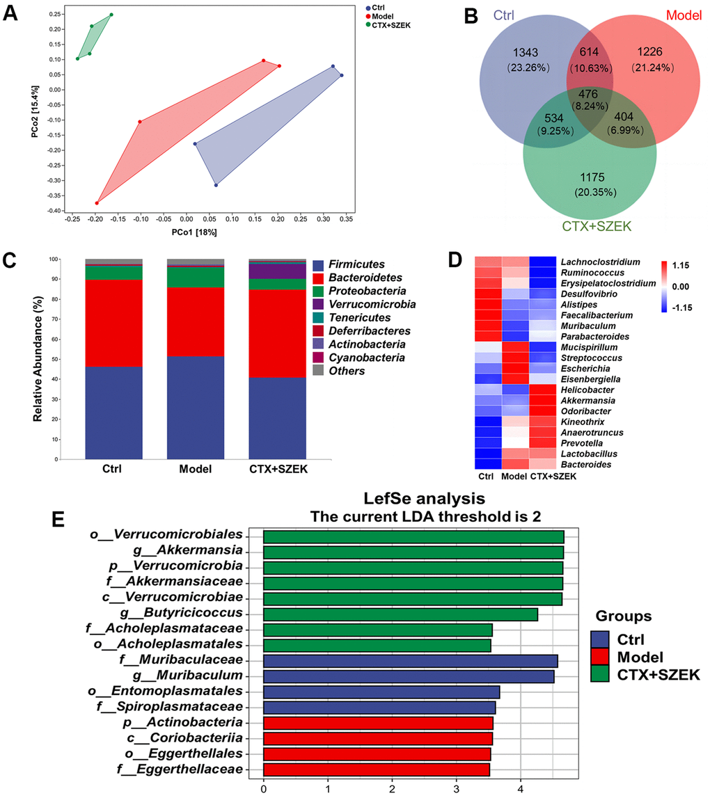 In this study, we established a mouse model of hematopoietic dysfunction via intraperitoneal CTX injection, explored the hematopoietic improvement effect of SZEK in mice, and studied the mechanism of action of SZEK in promoting hematopoiesis by combining microbial 16S rRNA high-throughput sequencing technology with serum metabolomic analysis based on ultra-high-performance liquid chromatography-mass spectrometry.