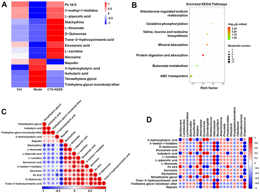 Four serum samples were collected from the Ctrl, Model, and SZEK groups for metabolomic analysis. Serum samples were upsampled on an ultra-performance liquid chromatography (UPLC) system (Agilent 1290 Infinity LC, Thermo Fisher Scientific, Waltham, MA, USA) configured with an ACQUITY UPLC BEH Amide chromatography column (2.1 mm × 100 mm). Serum was analyzed for significant changes in differential metabolites using chromatography-mass spectrometry, and the differential metabolites were subjected to cluster and KEGG analyses, as in our previous study [65].